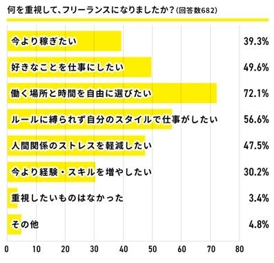また、すでにフリーランスとして働いている人は、「働く場所や時間の自由」「好きなことを仕事にする」など、やはりフリーランスならではの自由さを求めている人が多いことがわかりました。