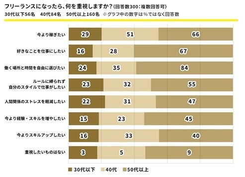 ■年代で仕事観に変化。40代は「稼ぎ」50代以上は「自由」重視