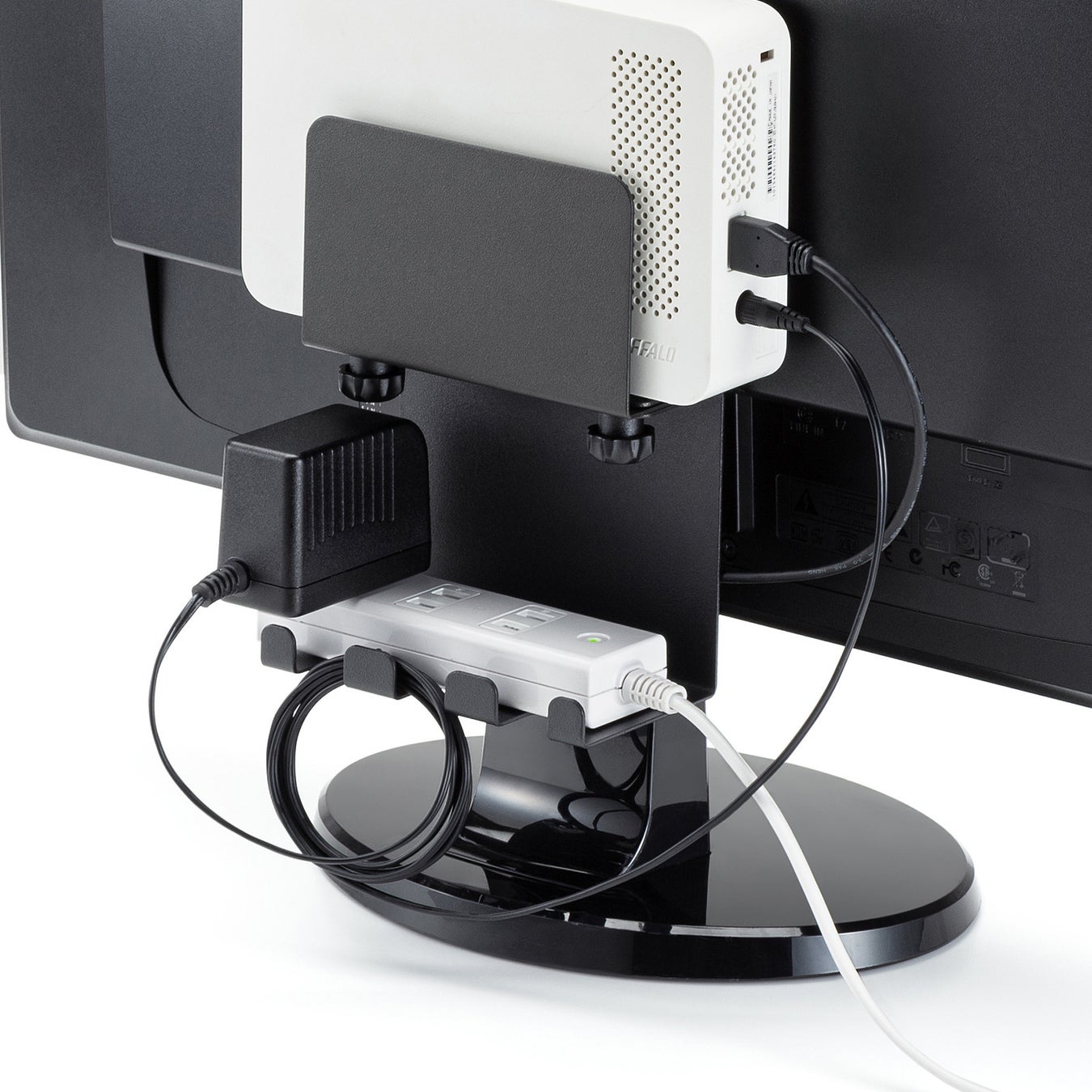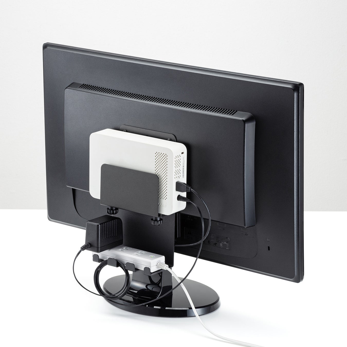 本製品をディスプレイ裏に取り付けることで、小型パソコンやハードディスクなどの小型機器やタップ、配線ケーブルをディスプレイ裏にまとめて収納できます。