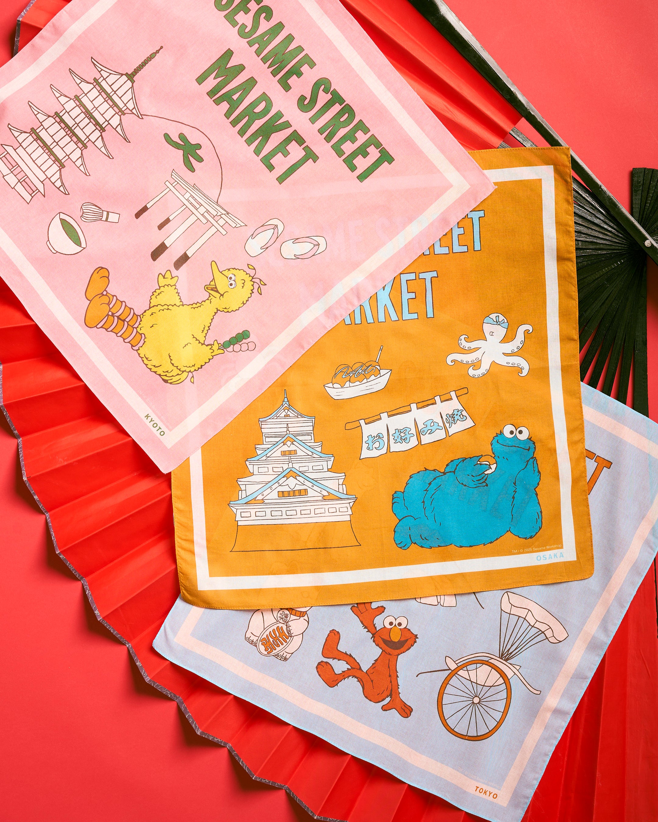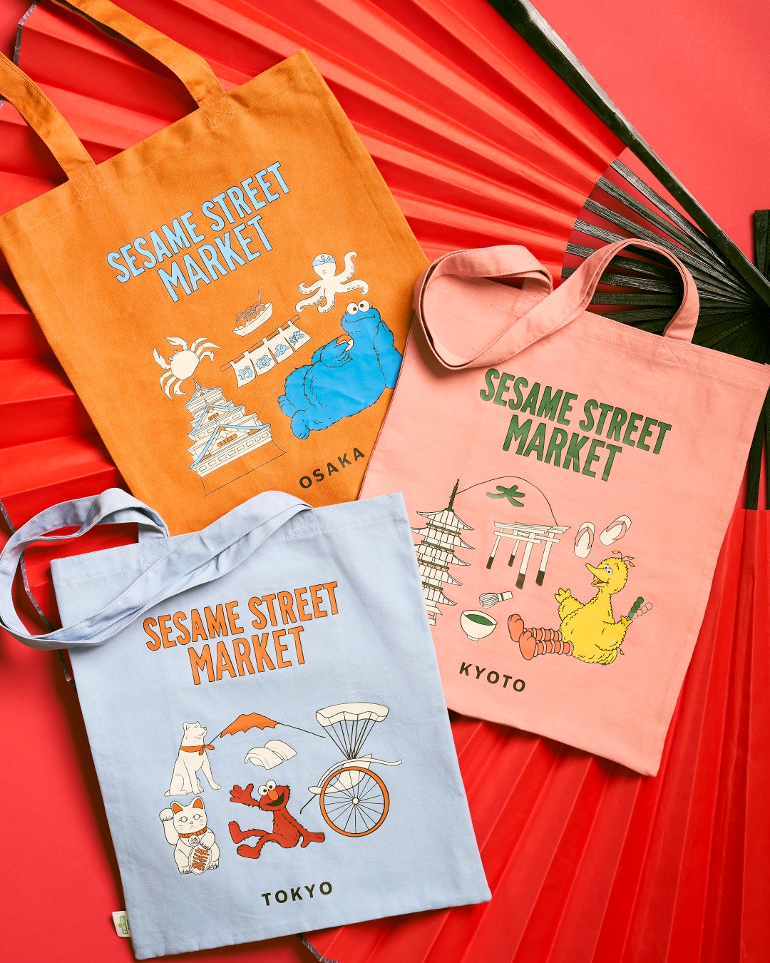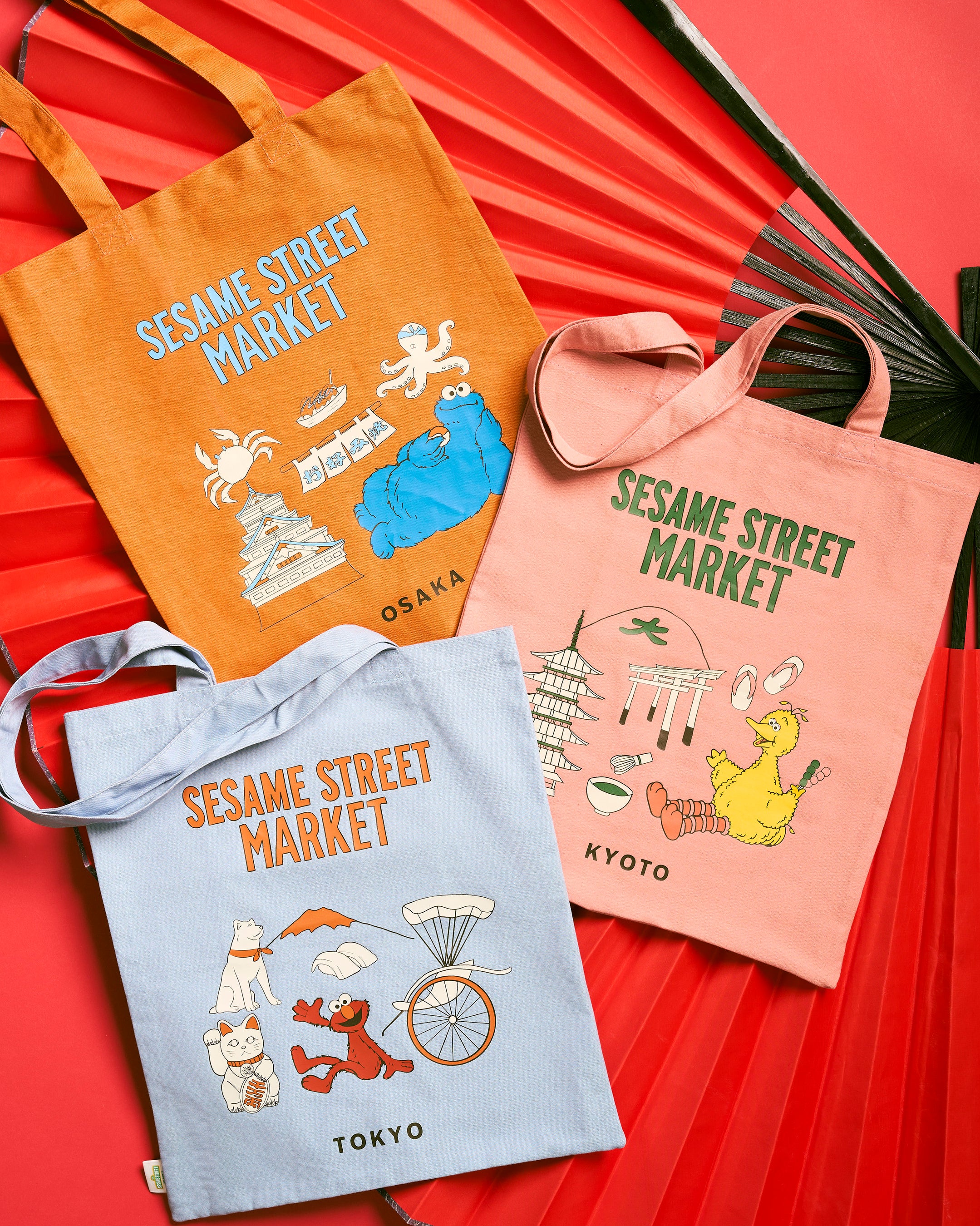 日本各地の名物や名所をモチーフに、セサミストリートの仲間たちを組み合わせたユニークなデザインのトートバッグとバンダナが登場。東京、大阪、京都をテーマに、エルモ、クッキーモンスター、ビッグバードたちをご当地ならではのアイコニックなモチーフとともにあしらいました。日常に取り入れやすい、落ち着いたレトロなカラーリングも魅力のひとつです。