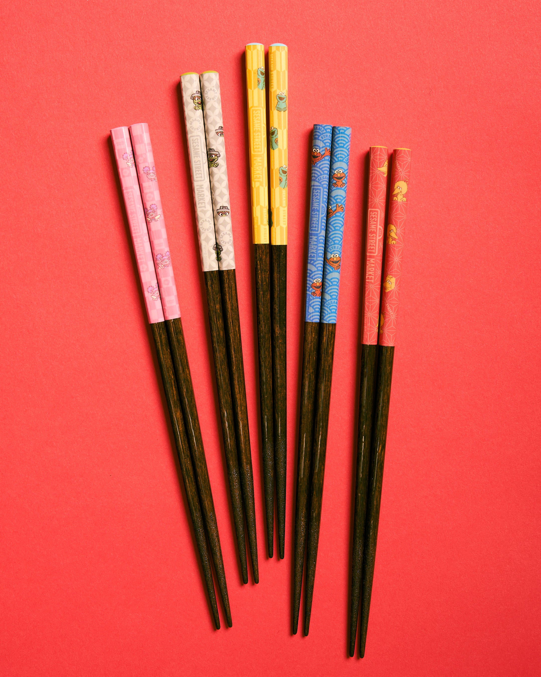 波柄、市松模様、麻の葉などの伝統的な和柄に、エルモ、クッキーモンスター、ビッグバード、オスカー、アビーたちがさりげなく潜む、遊び心あふれる箸が新登場。