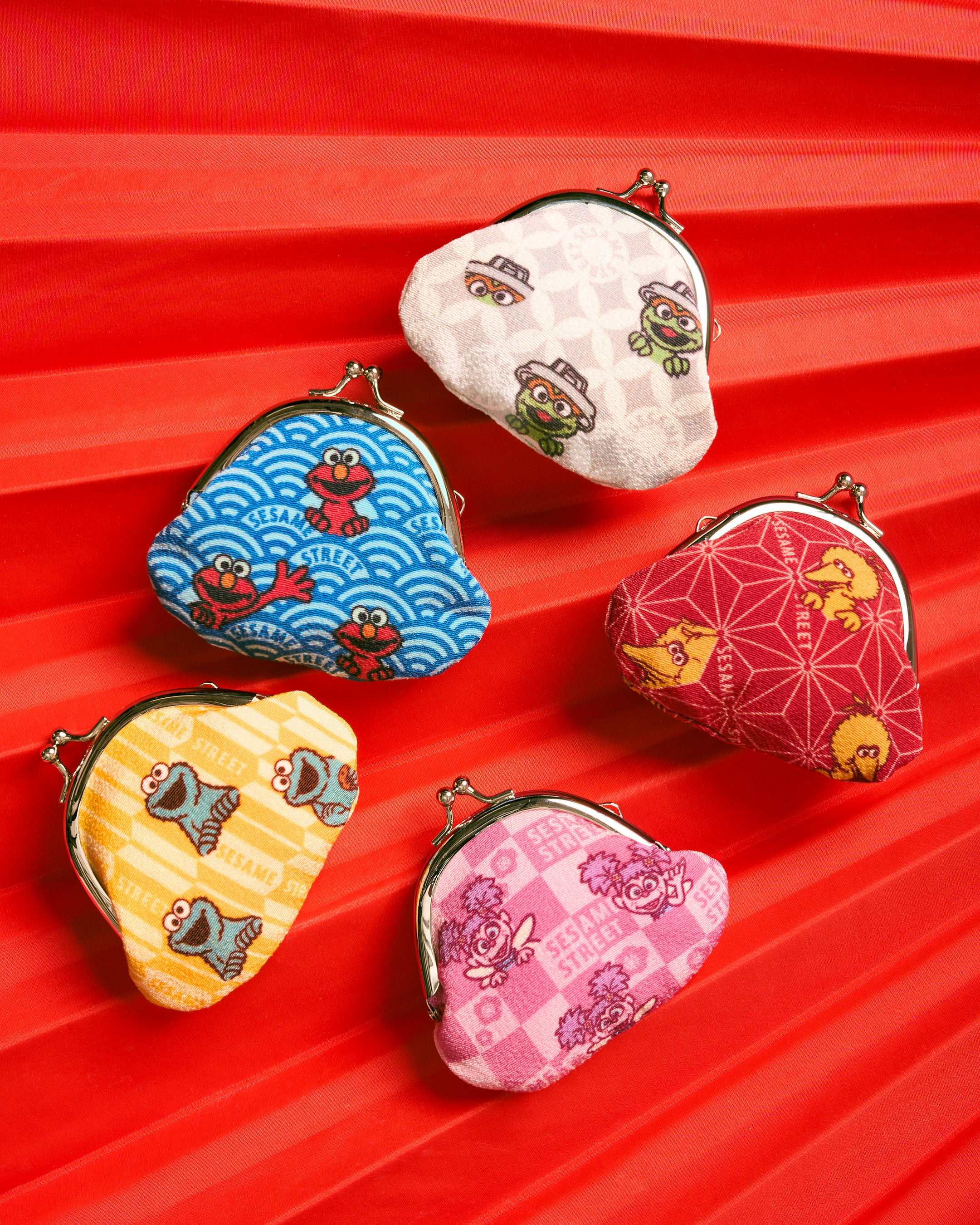 伝統的な和柄の中にセサミストリートのキャラクターたちがさりげなく潜む、カラフルながま口ミニコインポーチ。手のひらにおさまる小ぶりなサイズ感で、小銭はもちろん、アクセサリーなどの細かいアイテムを持ち運ぶのにもぴったりです。