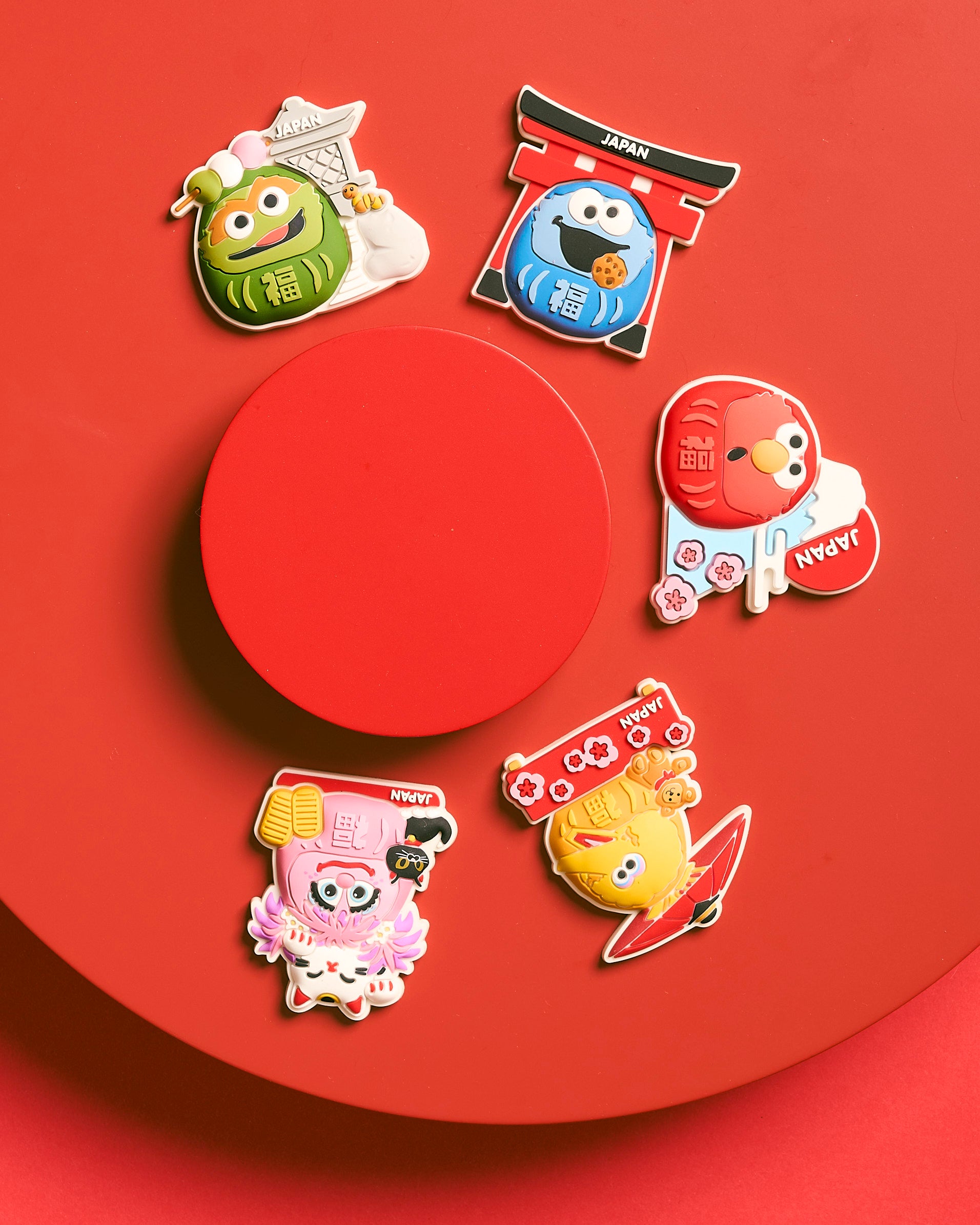 日本ならではの風景の中に、だるまになりきったセサミストリートの仲間たちを描いたキャッチーなデザインのマグネット。エルモには梅と富士山、クッキーモンスターには鳥居、オスカーにはお団子と石灯籠、ビッグバードには和傘、アビーには招き猫など、それぞれに日本らしいモチーフを取り入れました。冷蔵庫やデスク周りに貼るだけで、空間を明るくにぎやかにしてくれるアイテムです。