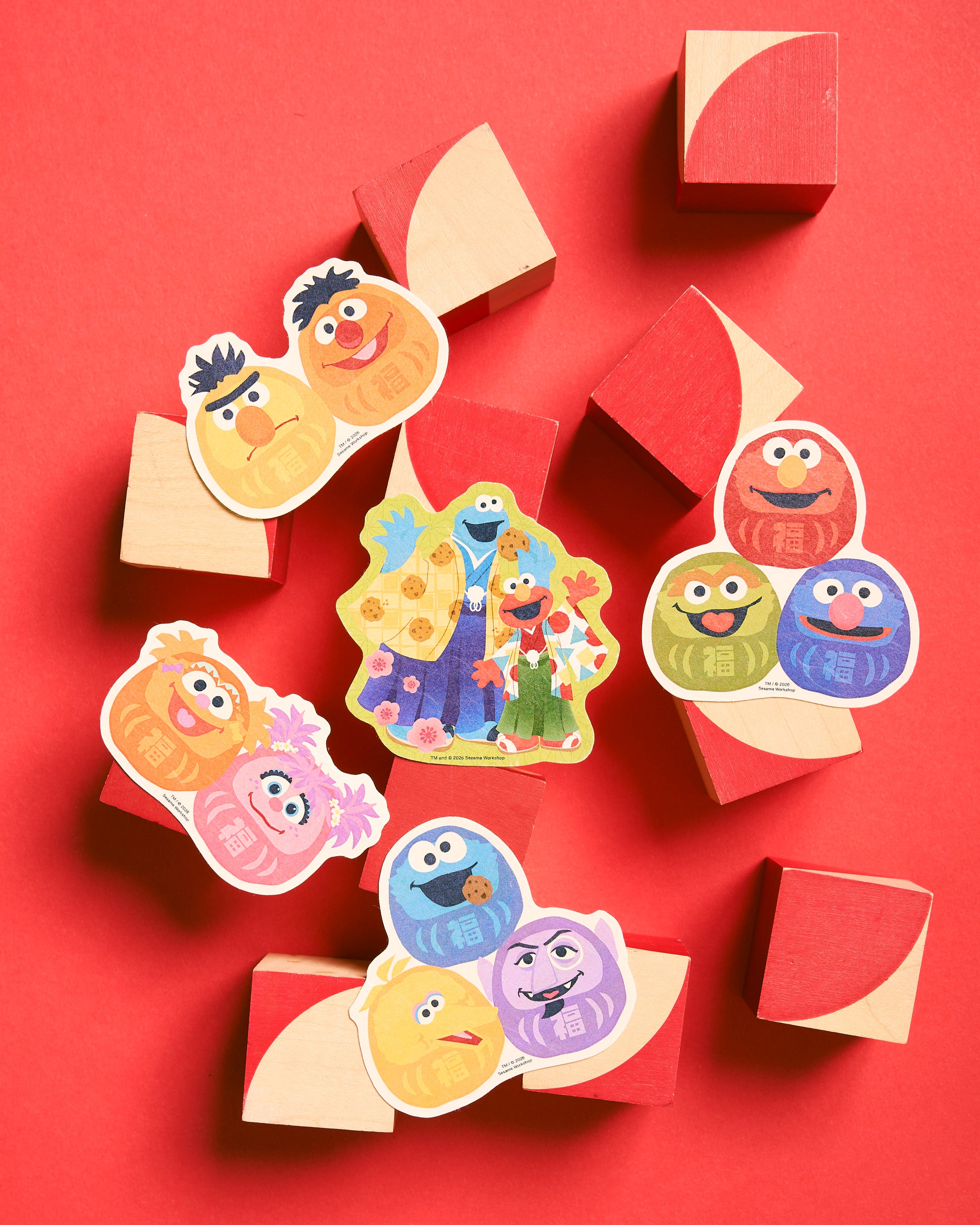 だるまになりきったキャラクターたちと、着物姿のエルモ&クッキーモンスターをモチーフにしたステッカー。お気に入りのキャラクターやカラーからお好みのデザインをお選びいただけます。パソコンやノートに貼ったり、スマホケースに挟んでいただくのもおすすめです。