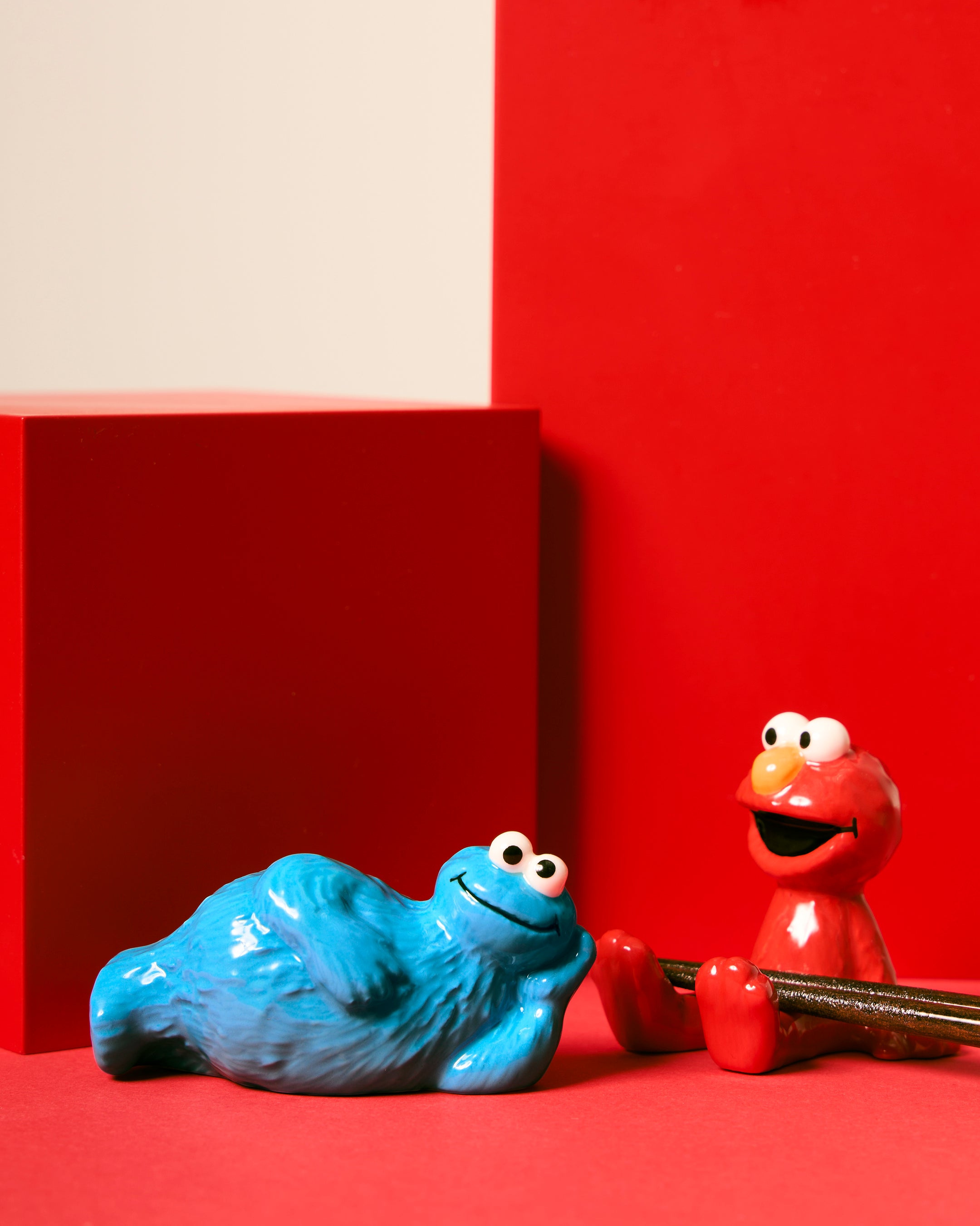 のんびりとしたポーズでくつろぐエルモとクッキーモンスターが、ほっと気持ちを和ませてくれるデザインの箸置き。