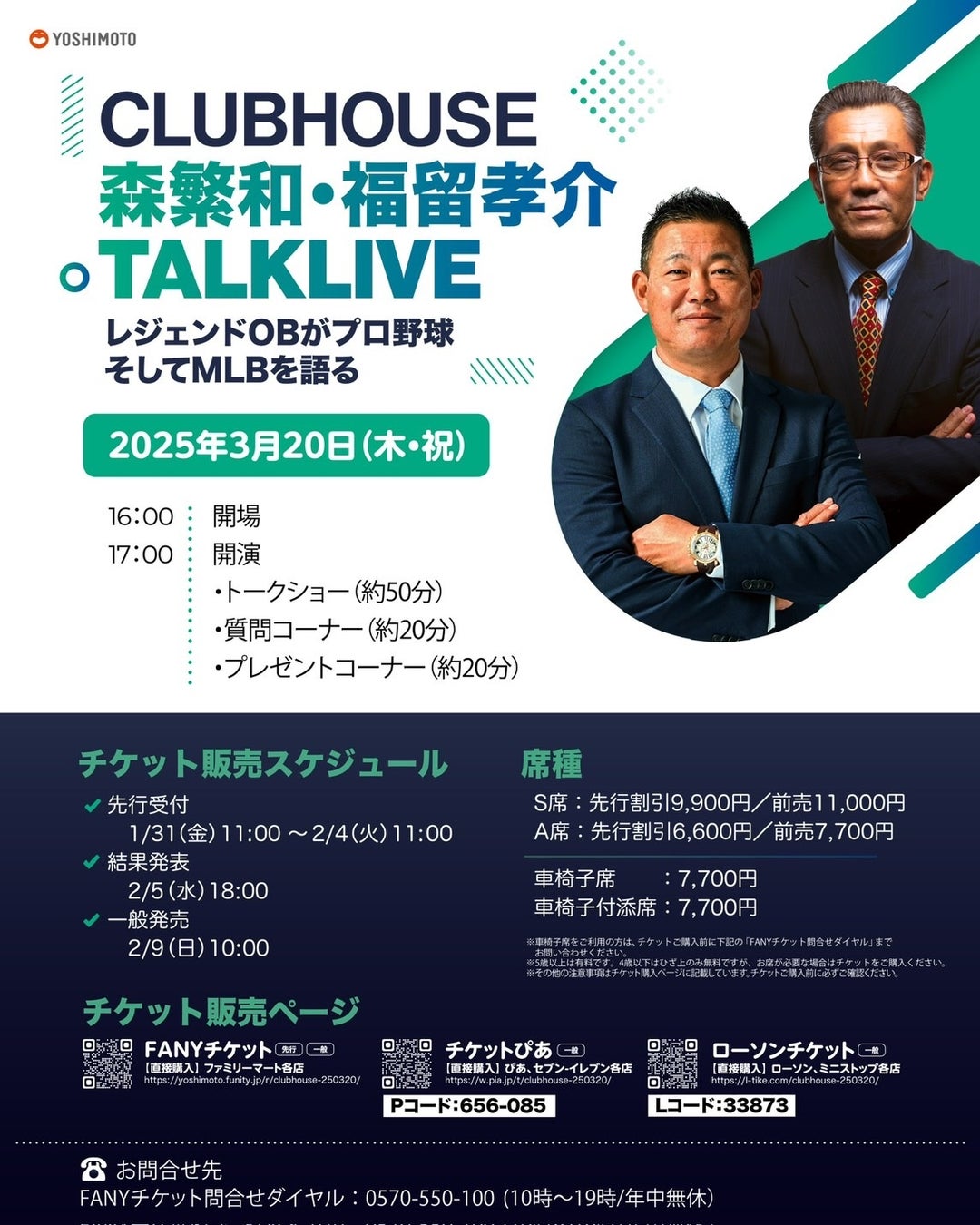 株式会社よしもとスポーツは、3月20日(木・祝)にTOKYO FMホール(東京都千代田区)で、「CLUBHOUSE」森繁和・福留孝介TALKLIVEを開催します。
