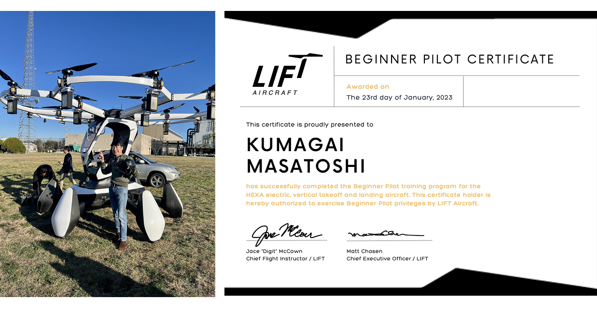 熊谷は、かねてより空に大きな夢を抱き、ヘリコプターと飛行機の操縦免許を有するなど、“日本で最も空に精通する経営者”を目指してまいりました。こうした中、2023年1月に、アメリカ・テキサス州でLIFT Aircraft社製の電動垂直離着陸機(eVTOL)「HEXA」の操縦訓練を行い、日本人で初めて初級・操縦士証の交付を受けたことで、米国航空法上における「空飛ぶクルマ」のパイロットとなりました。