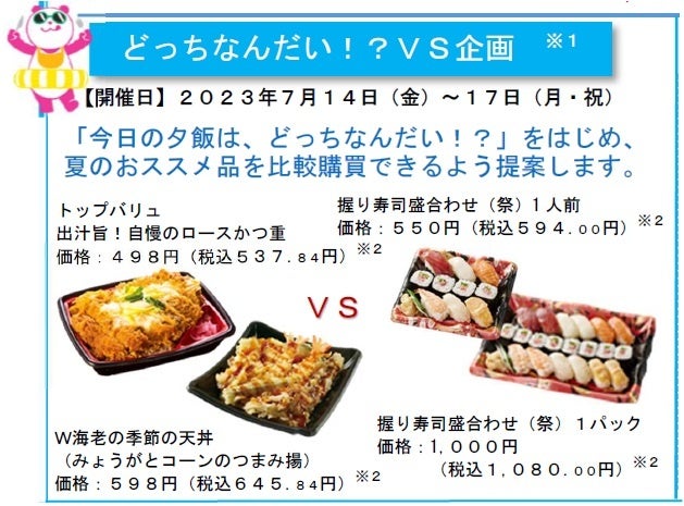 光熱費や物価の高騰などにより、節電や節約意識が高まる一方、旅行やお出かけに対する消費は増加傾向にあります。こうしたなか当社では、ファミリーやキッズをはじめ幅広いお客さまに“イオンでクールシェアする夏”を楽しんでいたけるよう、「ギネス世界記録チャレンジ」や「デジタルスタンプラリー企画」や、夏のおすすめ品を比較購買できる「どっちなんだい!? VS企画」など、お客さまが主役の参加型イベントを開催します。また、国産うなぎ蒲焼や黒毛和牛、ガーリックライスなどガッツリ食べられる“高コスパ”夏のスタミナメニュー等、「ご予約販売会」限定商品を含めたお得なセール商品を昨年より1.7倍の最大980品目に拡大します。