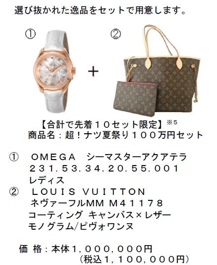 7月14日(金)からの開催に先駆け、4日(火)より店頭とネットにて「希少・あこがれ」をテーマに、数量限定品を集めた予約販売会を実施します。100万円超の「ブランドバッグと時計のセット」から、あこがれの家電、話題のトレンドアイテムまで、夏の消費を刺激するプレミアムな品を用意します。