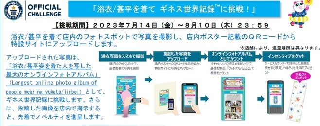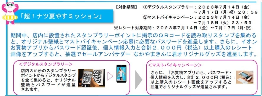 夏休みへの期待やワクワク感が高まるこの時期に、幅広いお客さまにお出かけ先としてのイオンをより一層楽しんでいただくため、浴衣/甚平を着た人を写した最大のオンラインフォトアルバム達成を目指す「超!ナツ夏祭りギネス世界記録チャレンジ!」企画や、館内に設置されたスタンプラリーポイントからデジタルスタンプを全て集めるとオリジナル壁紙と抽選会に参加するパスワードを進呈する「超!ナツ夏やすミッション」企画等を用意し盛り上げます。