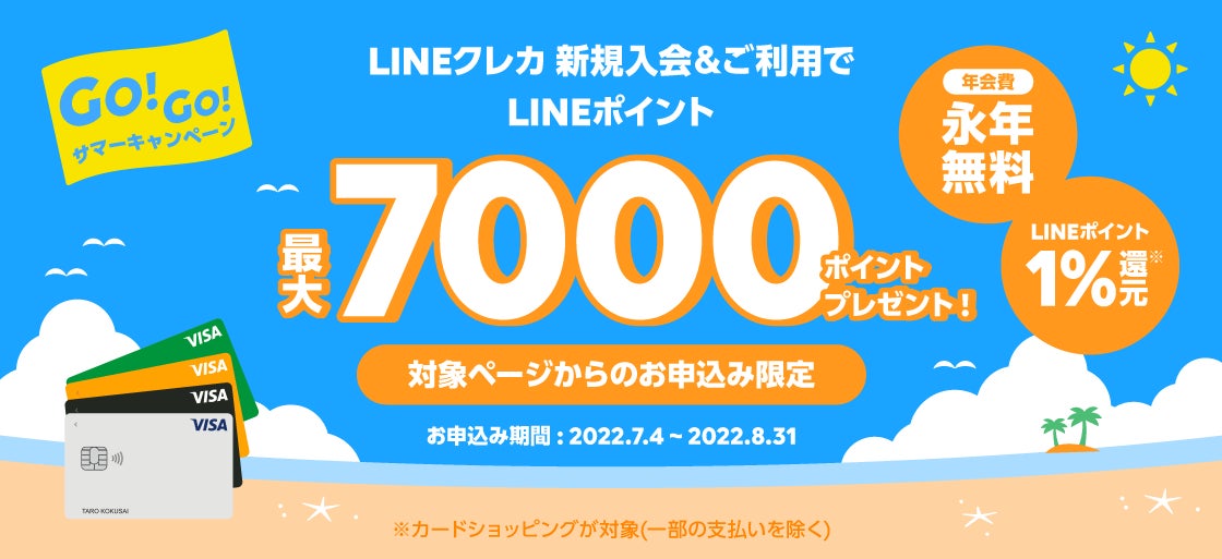 LINE Pay株式会社(本社:東京都品川区、代表取締役社長CEO:前田 貴司)は、2022年7月4日(月)から2022年8月31日(水)までの間にVisa LINE Payクレジットカード(以下、LINEクレカ)に新規ご入会いただき、キャンペーンの条件を達成された方に、LINEポイントを最大7000ポイントプレゼントする「GO!GO! サマーキャンペーン」を開催いたします。