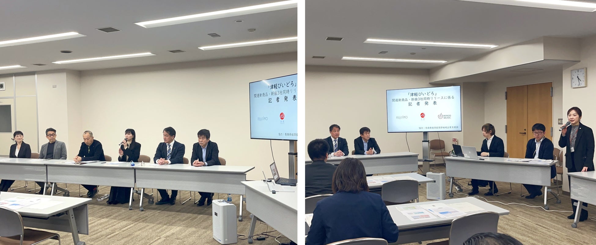 「津軽びいどろの風鈴傘」の商品の開発経緯をフェリシモから発表しました。また本商品の企画をきっかけに北洋硝子からも、本商品の形に合わせた津軽びいどろNEBUTAシリーズより「ねぶた風鈴」の発売を発表しました。そして、りんご娘からも本商品の企画をきっかけに、津軽びいどろをモチーフにした楽曲の制作がはじまり、本商品のデザインが衣装として採用された経緯を発表。津軽びいどろを用いた新曲『硝子のリンゴたち』のPVの初公開が行われました。