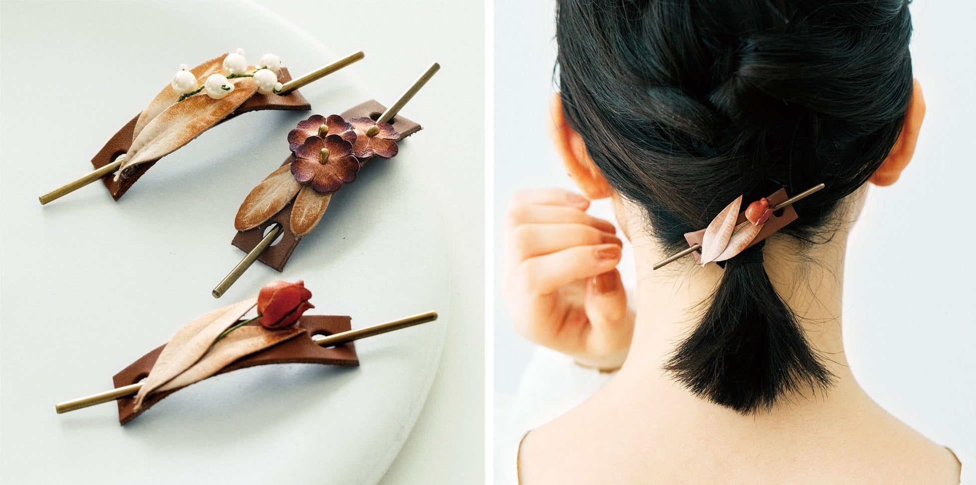 お花を模した本革のパーツを福祉事業所のみなさんがていねいに染めたマジェステです。甘くなりすぎない、大人かわいい印象でへアアレンジが簡単にできます。