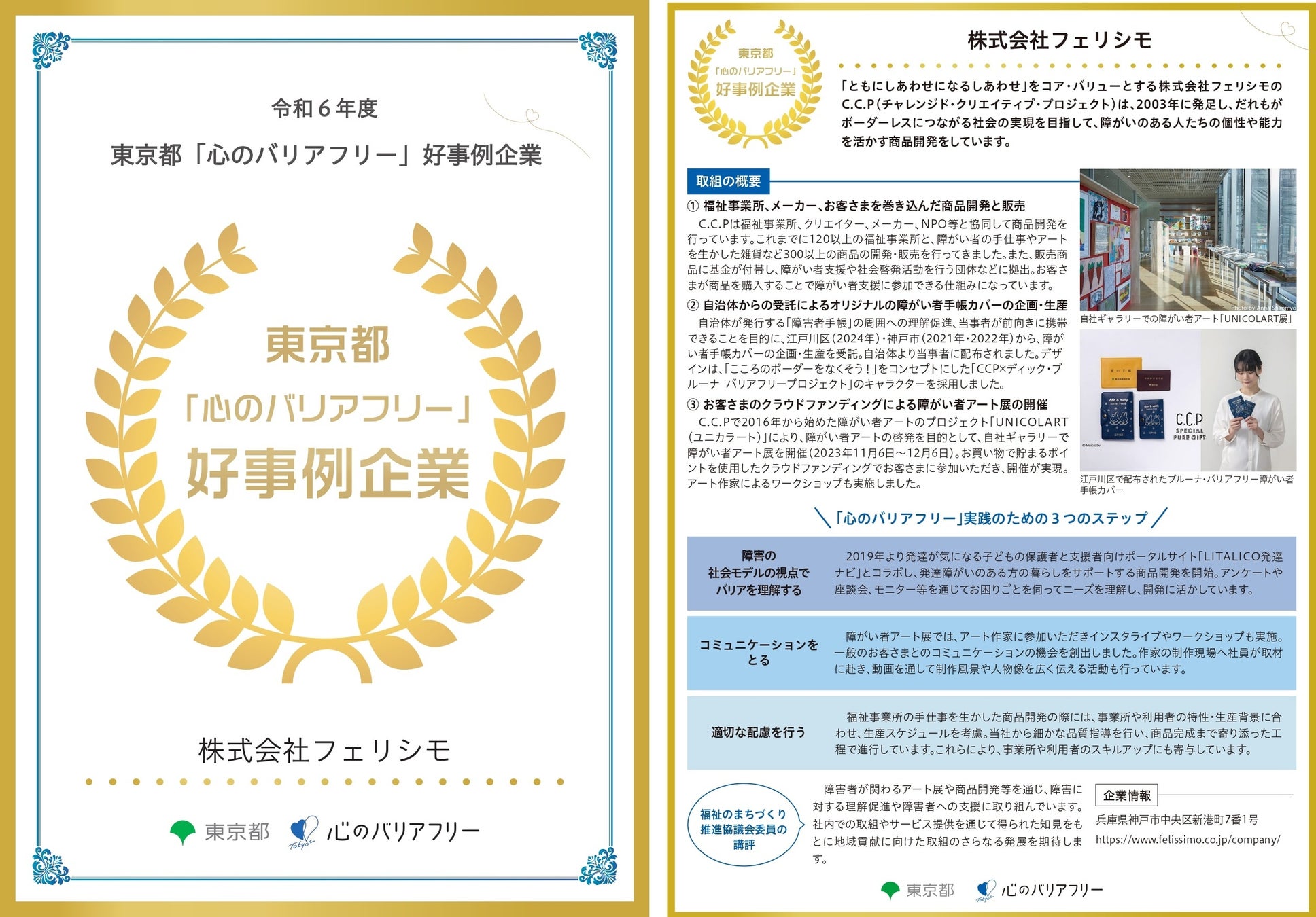フェリシモは3月24日、C.C.P[チャレンジド・クリエイティブ・プロジェクト]の活動が評価され、東京都「心のバリアフリー」好事例企業と認定されました。