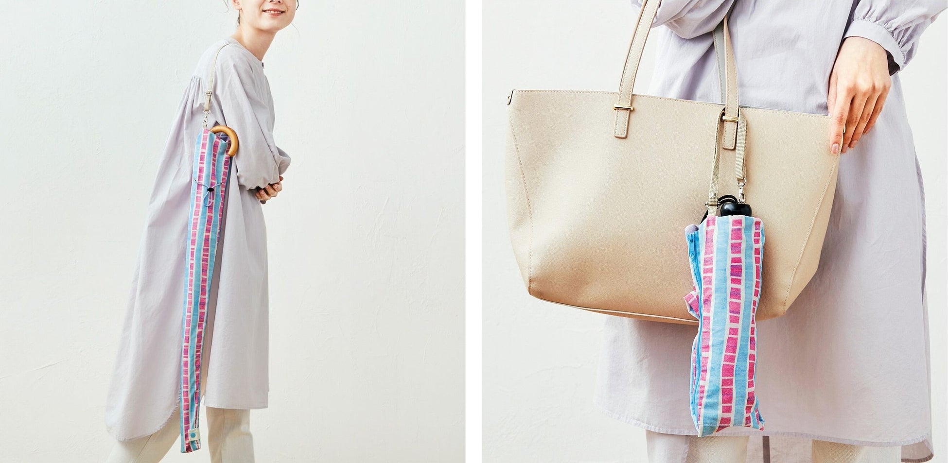 刺しゅうのように見えるストライプ模様がさわやかな印象の傘ケースです。サイズを調節すれば、長傘と折りたたみ傘のどちらにも使えます。ストラップの調節で肩に掛けたりバッグに付けたりできるので、持ち歩きに便利です。