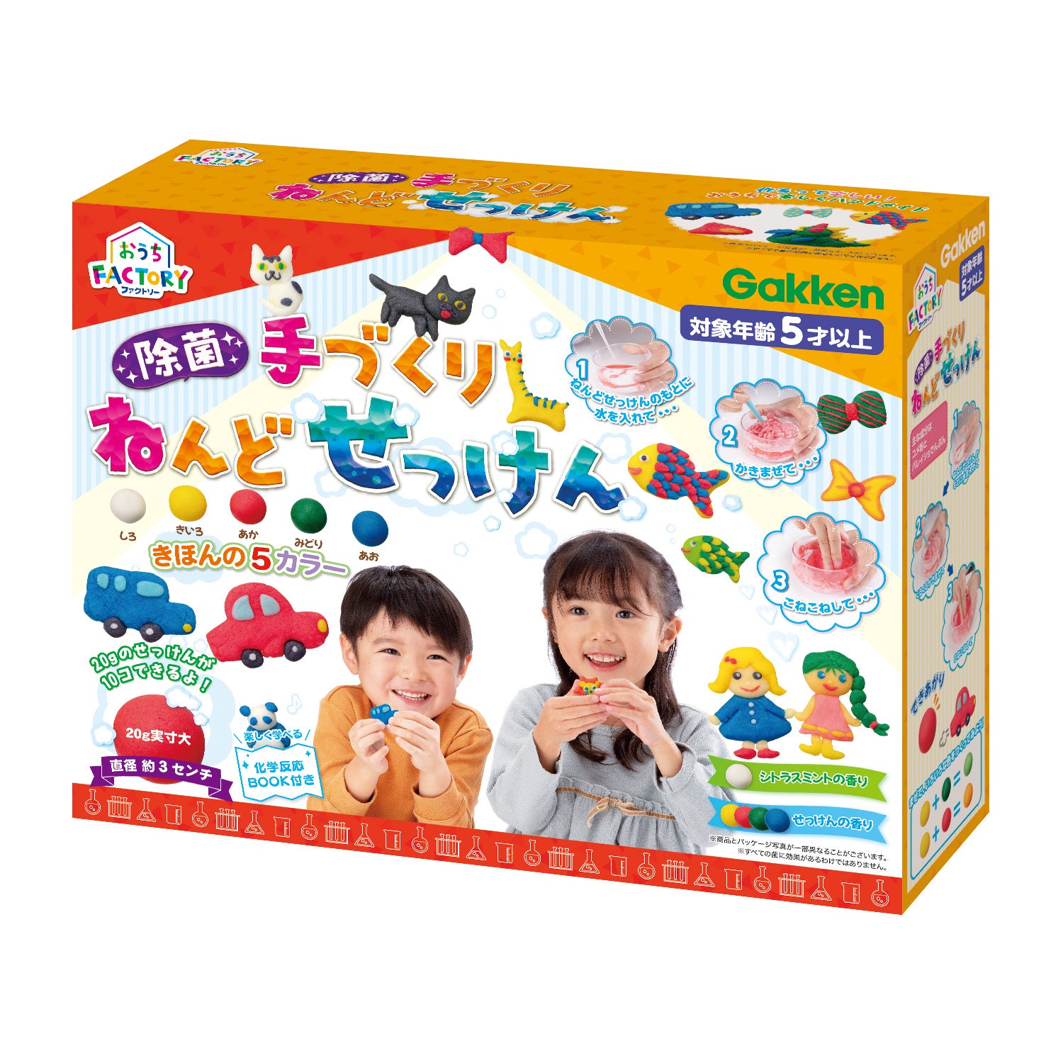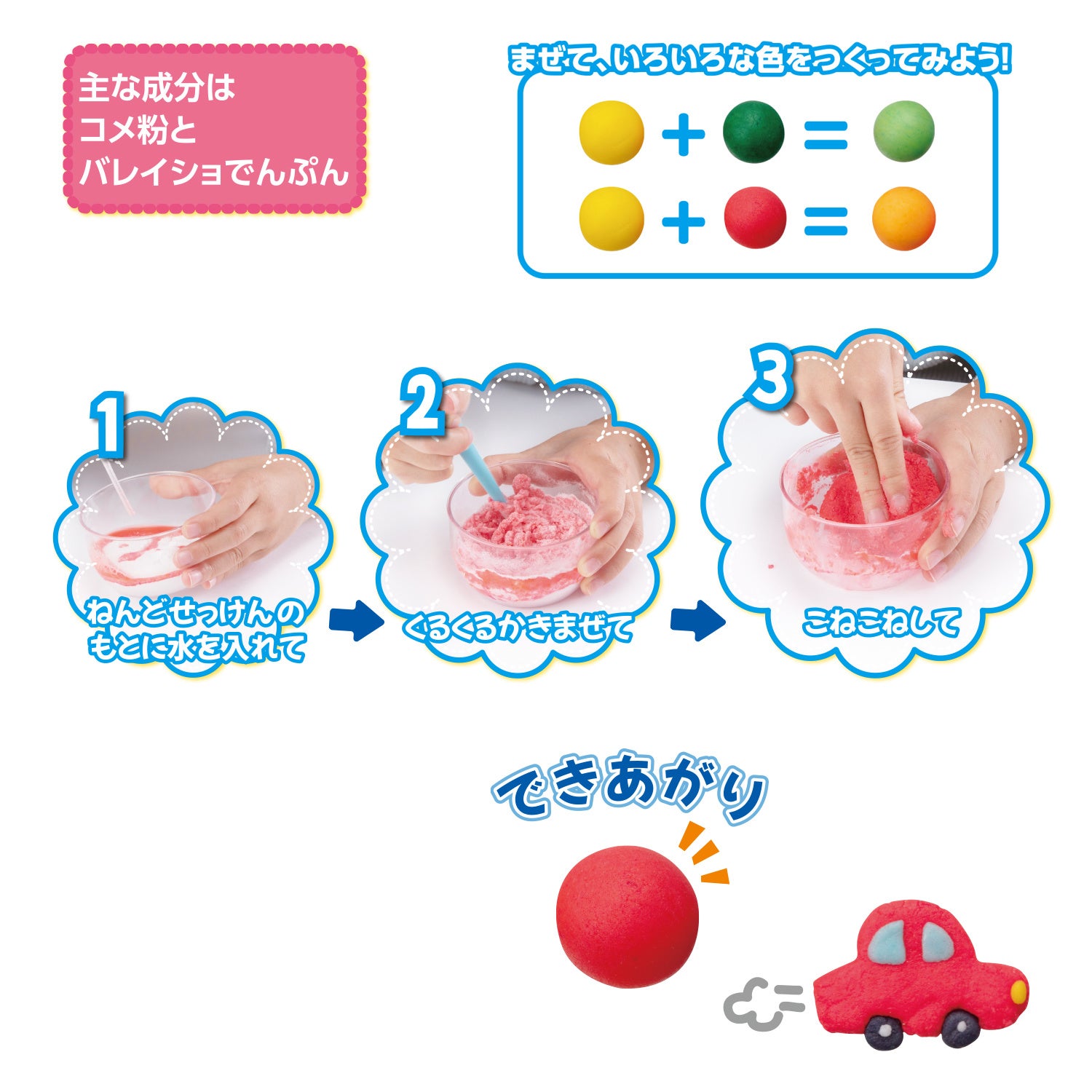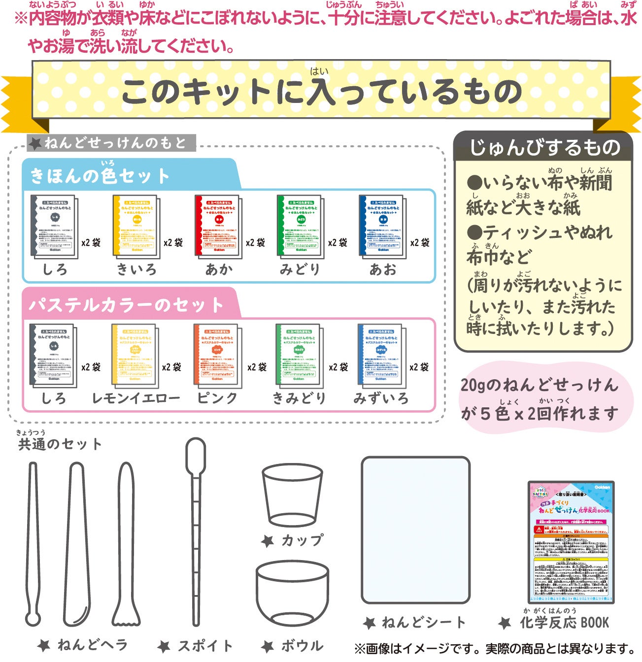 内容: ねんどのもと5色×2袋、ボール、カップ、スポイト、ヘラ3本、ねんどシート、化学反応BOOK(取り扱い説明書)