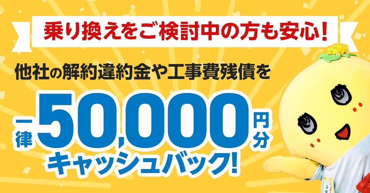 現在ご利用中のインターネット回線から『とくとくBB光mini』へお乗換えされる際に解約違約金等の支払いが発 生する場合、解約違約金補助として違約金の金額に関わらず、一律50,000円キャッシュバックいたします(※5)。