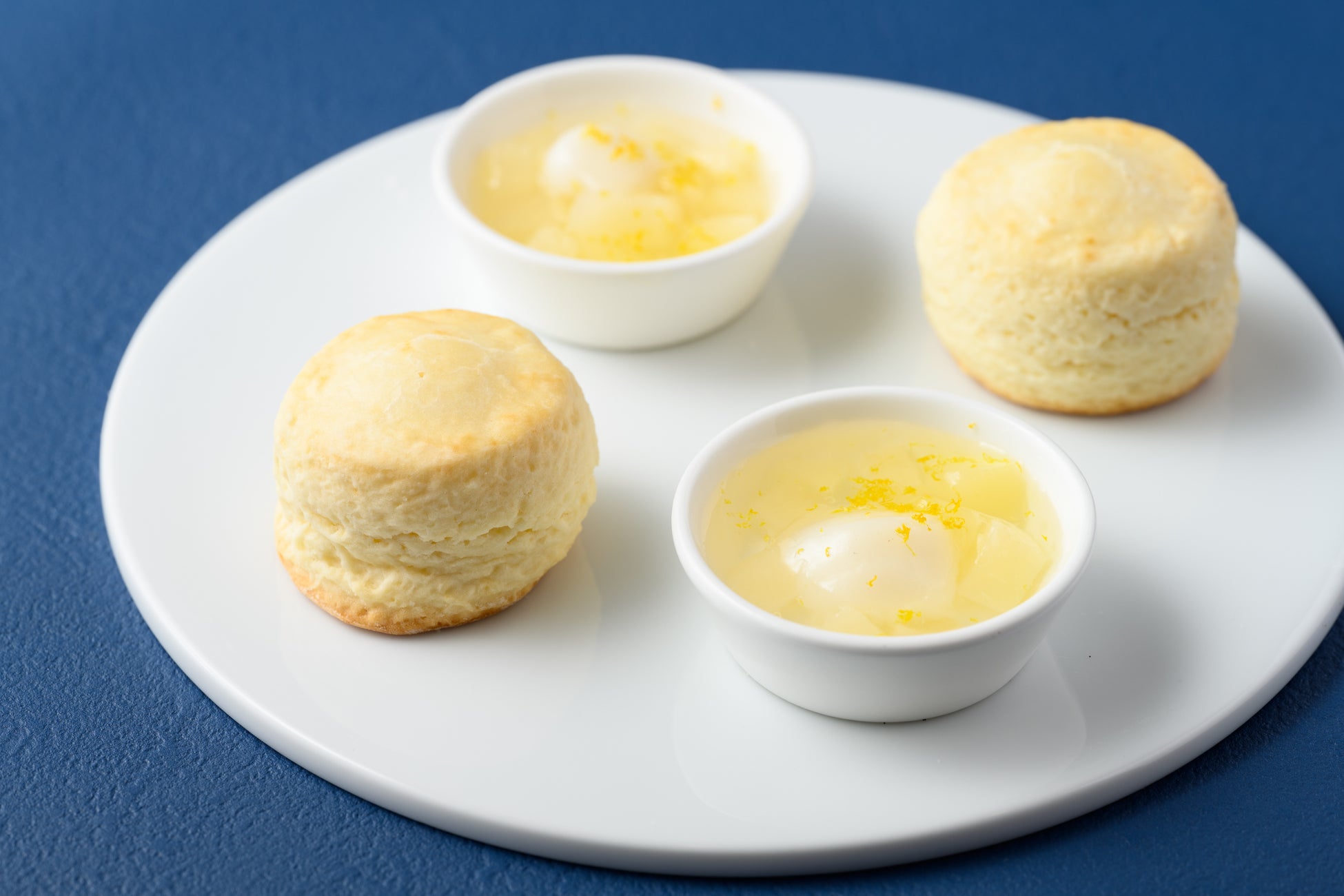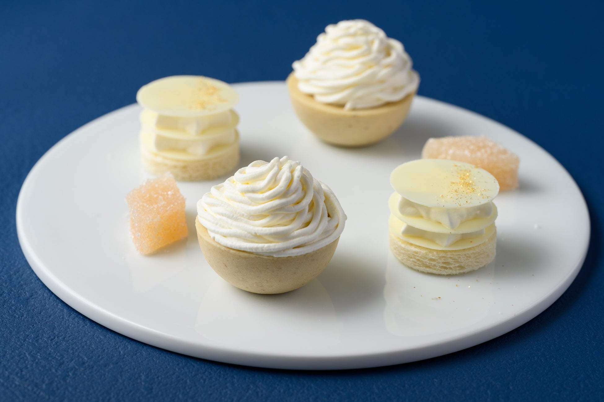 しっとりと焼き上げた、可愛らしい白いスコーンと、もちもちとした白玉・ココナッツ寒天を組み合わせた趣あるデザート。ココナッツのやさしい甘さと香りが上品な余韻を残し、繊細な甘さと食感が、雪景色に佇むような心地よさを運んでくれます。