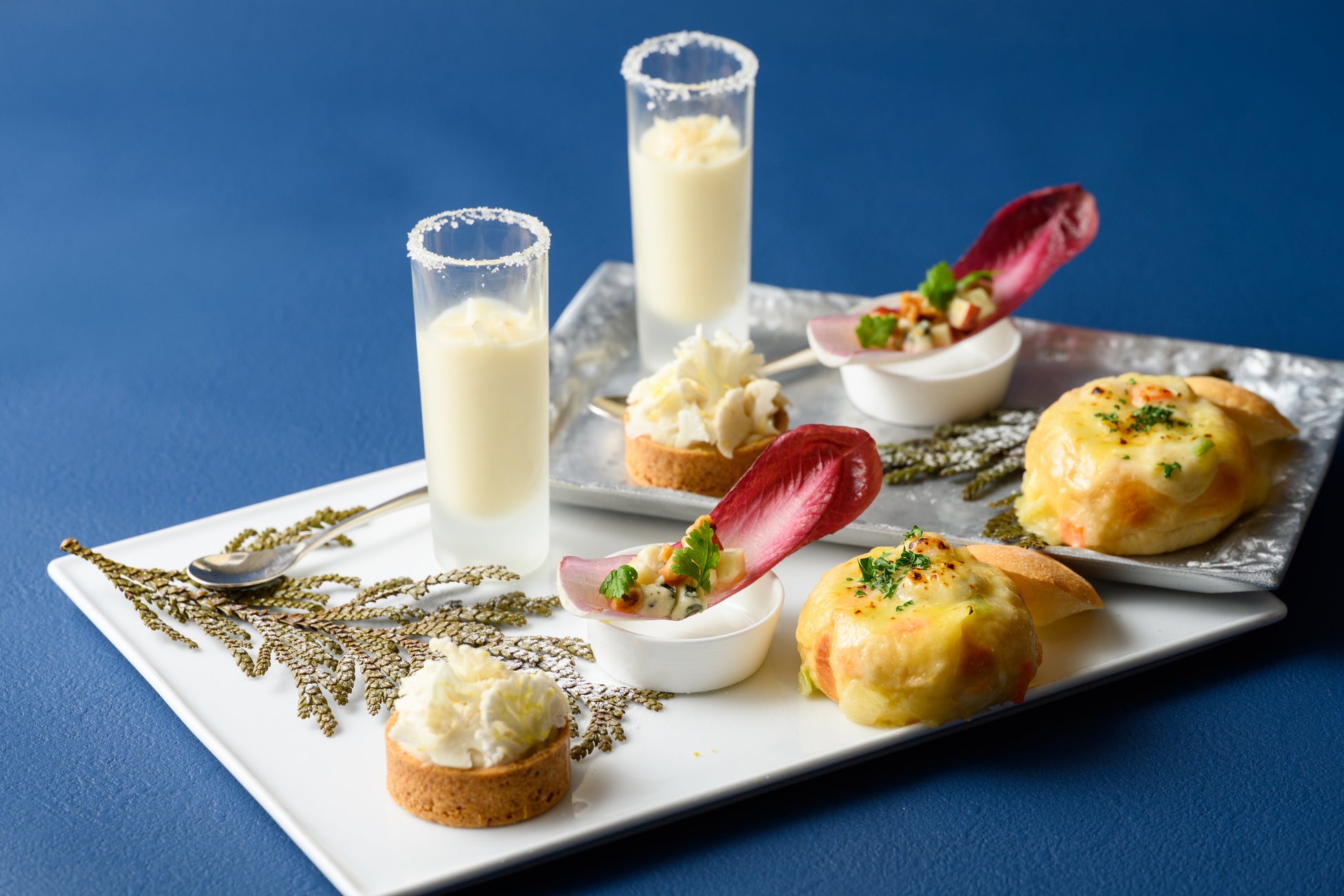 ジャガイモのスノーホワイトスープ、旬菜とフロマージュなど、白銀の世界に彩りを添える恵みを取り入れたセイボリーをお楽しみいただけます。