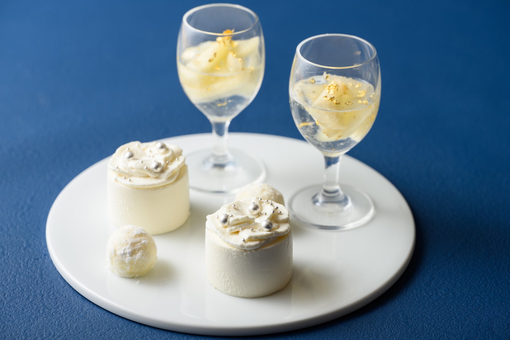 すっきりとした甘さの純白クリームを使用したショートケーキと、金箔を使いキラキラとしたレモン風味のジュレに洋梨のコンポートを合わせた爽やかなデザート。さらに、しっとりとした生チョコが入ったホワイトチョコクーゲルを添え、舞い降りる雪を思わせる清らかな味わいに仕上げました。