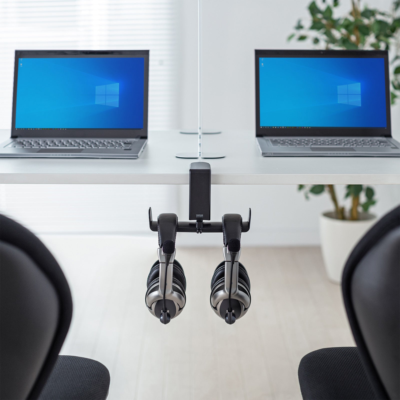 ワンタッチで気軽に設置でき、同時に2つのヘッドセットを収納できるので、業務で使用するオフィスやコールセンターにも最適です。