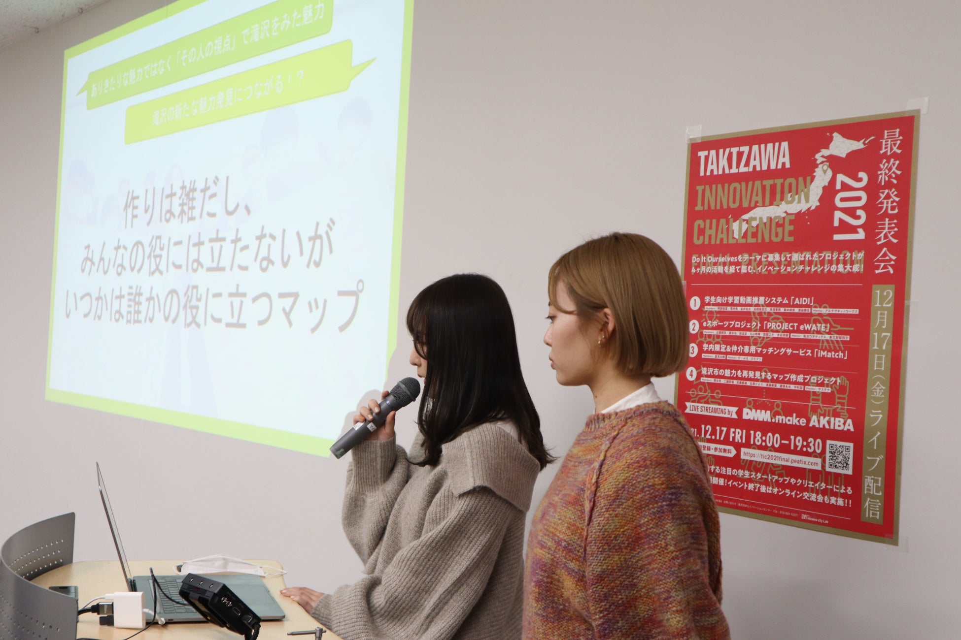 「Takizawa Innovation Challenge 2021」に採択された4つのチームが順に各チームの成果を発表しました。学生に合わせた学習用動画を推薦するシステムや、岩手県内のeスポーツ振興プロジェクト、学内限定・仲介専用のマッチングサービス、滝沢市の魅力を再発見するマップ作成プロジェクトと、学生らしい視点で考案されたプロジェクトが発表されました。
