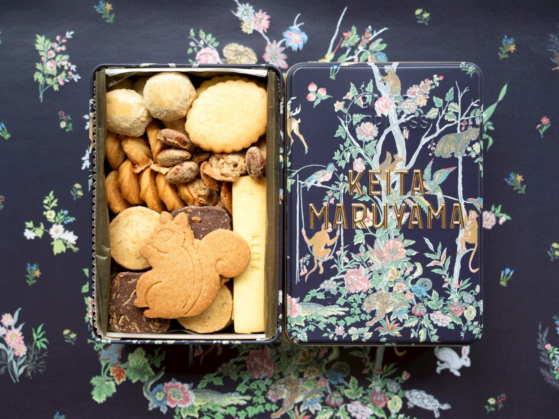 「KEITA MARUYAMA」のシグネチャーである花鳥柄をあしらった、人気の「Oriental Flower」のデザイン。中には、レモン風味のバタークッキーと香ばしいチョコレートクッキーなどで構成された見た目も味も異なる8種類のクッキーが詰まっています。