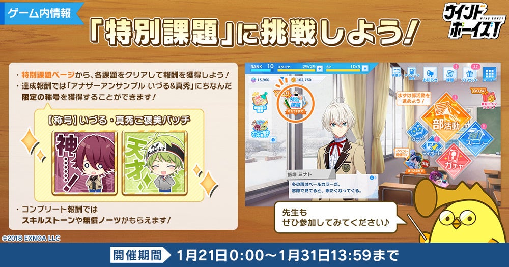 合同会社EXNOA(本社:東京都港区、CEO:村中 悠介、URL:https://games.dmm.com/)が運営するDMM GAMESは、生徒と奏でる青春育成ゲーム『ウインドボーイズ!』において、2023年1月21日(土)より、期間限定ガチャ「アナザーアンサンブル いづる&真秀」が開始したことをお知らせいたします。