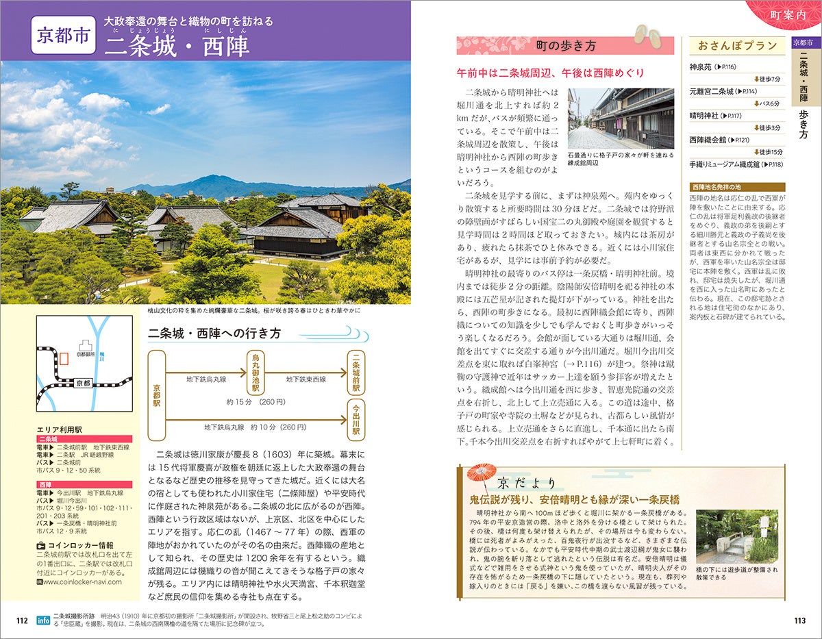 現在の二条城・西陣エリアは、平安京の時代、天皇の居所や政府諸官庁が配されていた最重要区画。京都がターニングポイントを迎えたこの地から、本書の町案内はスタートしています。海外ガイドと同じように、一つひとつの町の歩き方をモデルルートつきで解説。