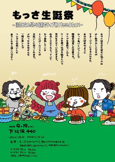 もっさ自身はオープニングアクトとして出演し、他3組のアーティストの弾き語りライブを観客と一緒に客席最前列で楽しむ予定となっている。