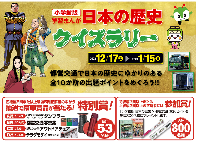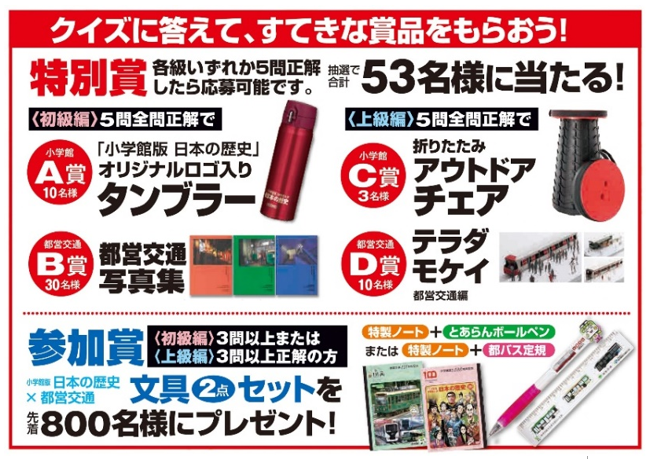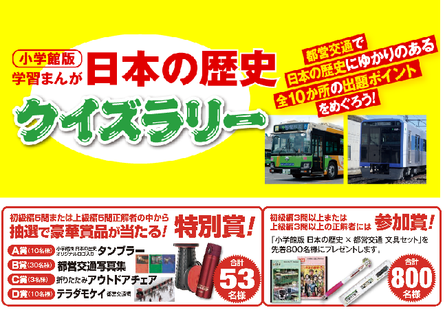 クイズの問題作成にあたっては、12月1日(木)に41年ぶりに全面リニューアル発売された『小学館版 学習まんが 日本の歴史』の監修・協力のもと初級編、上級編10問をご用意しました。正解数に応じて、『小学館版 学習まんが 日本の歴史』オリジナルロゴ入りタンブラーや「都営交通写真集」などのオリジナルグッズをプレゼントします。
