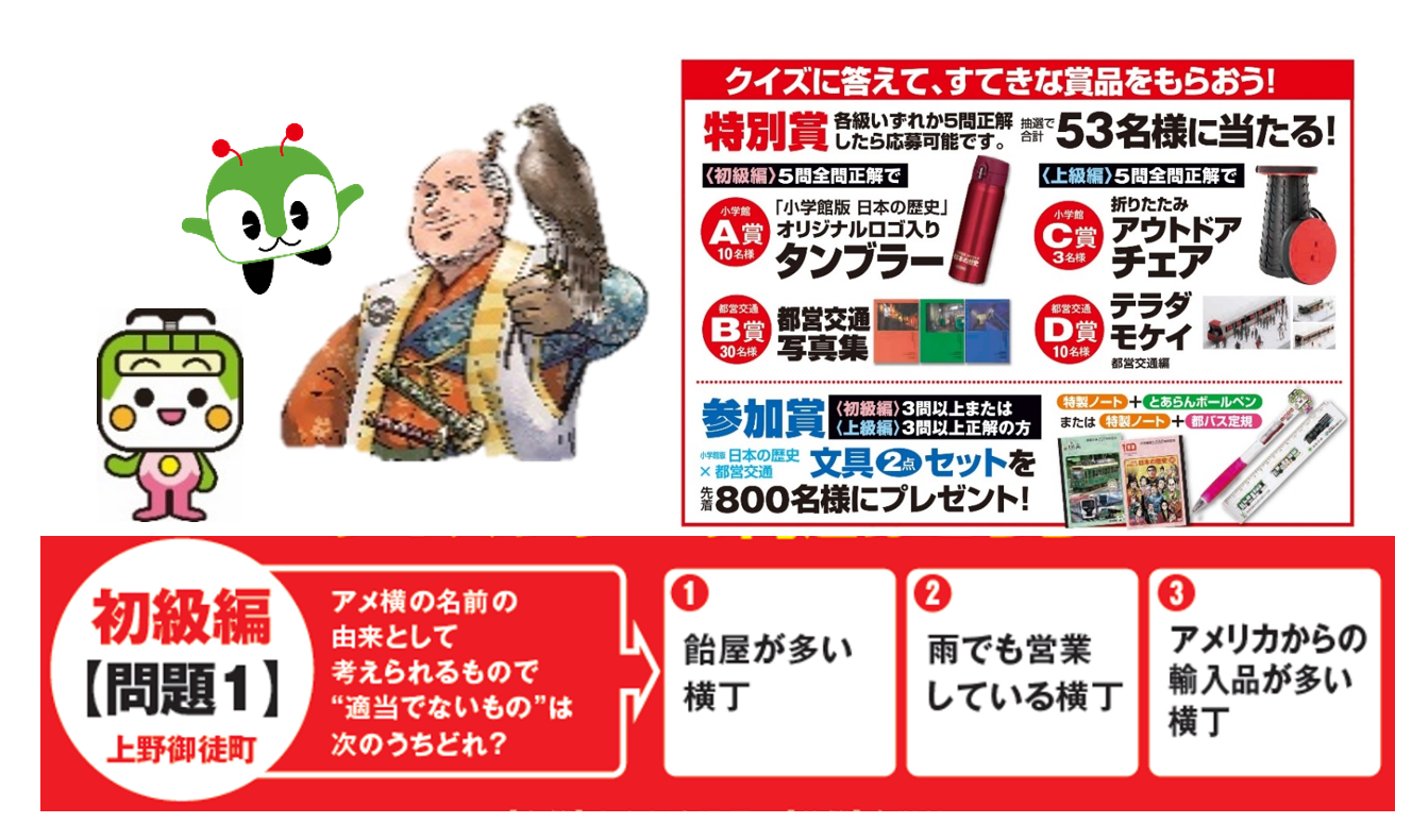○「日本の歴史」にゆかりのある都営交通10か所のクイズ出題ポイントをめぐり、‟解答用紙付きリーフレット“に答えを記入し、ツーリストインフォメーションセンター3か所(上野御徒町駅、新宿西口駅、新橋駅)に設置した専用の応募箱に投函。抽選で小学館や都営交通のオリジナルグッズをプレゼントいたします。