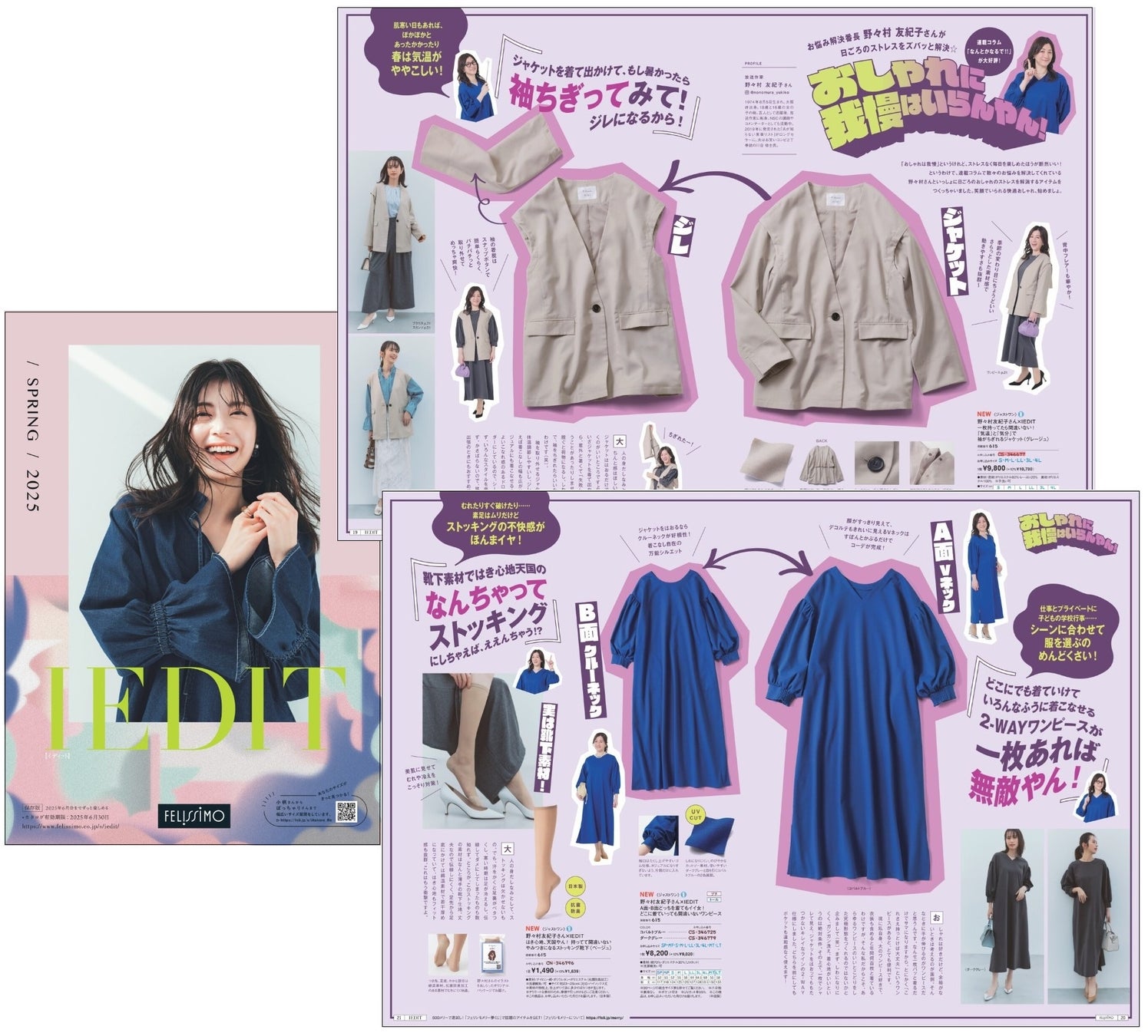 フェリシモが展開するファッションブランド「IEDIT [イディット]」は、放送作家・野々村友紀子さんとのコラボレーションファッションアイテムを発表、3月7日より特集ページを公開しています。「おしゃれは我慢」というけれど、ストレスなく毎日を楽しめたほうが断然いい!というテーマで、連載コラムで数々のお悩みを解決してくれている野々村さんといっしょに日ごろのおしゃれのストレスを解消するアイテムを作りました。 「気温」と「気分」で両袖を外して使えるジャケットや、シーンに合わせてVネックとクルーネックの両面を使えるワンピース、靴下素材で作られた履き心地抜群で伝線しにくいストッキング靴下の3点で、いずれも野々村さんらしい小気味いいアイデアで、笑顔でいられる快適おしゃれを提案しています。