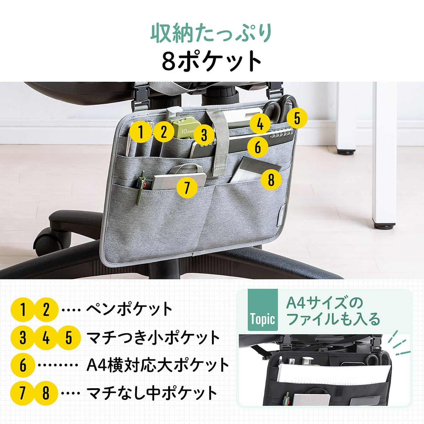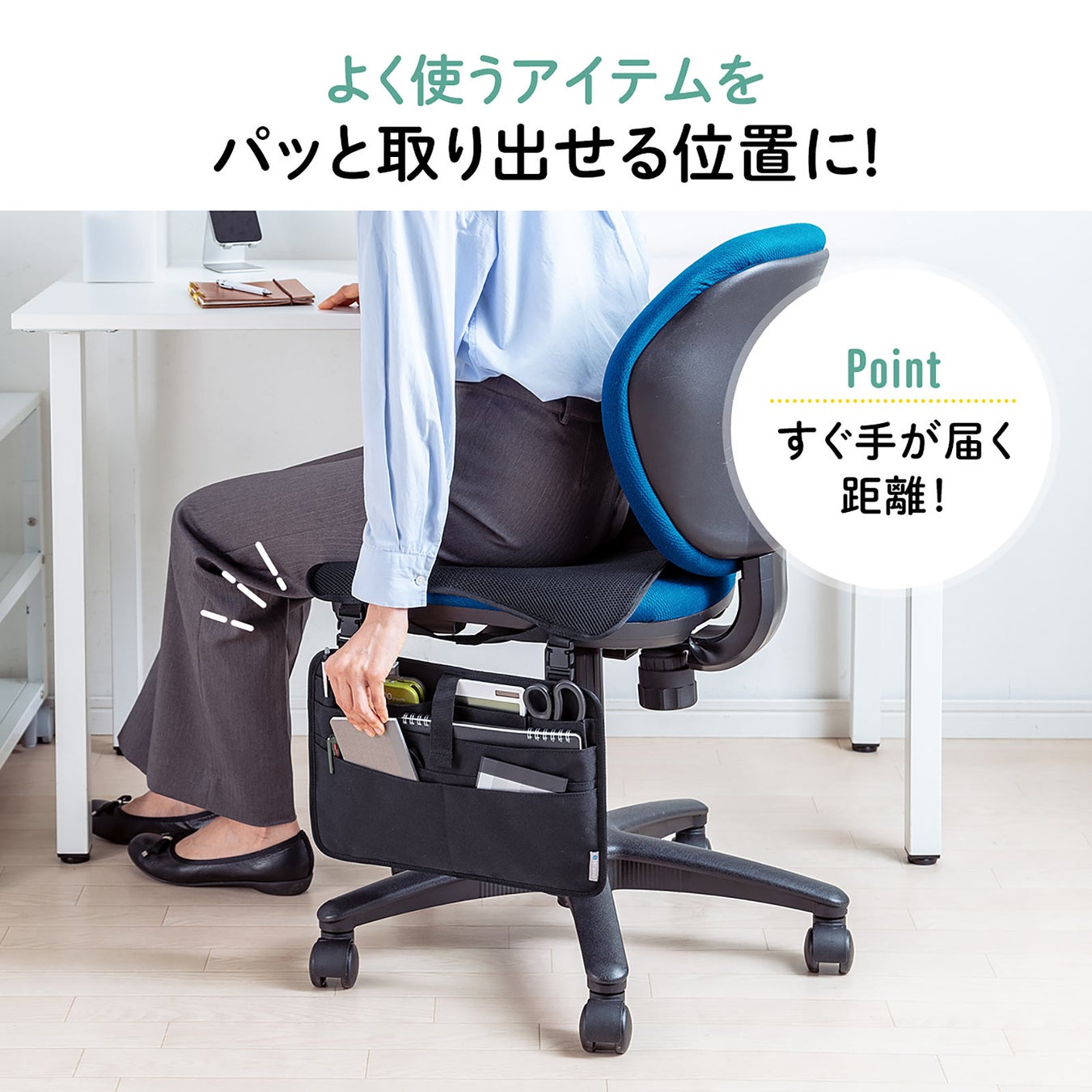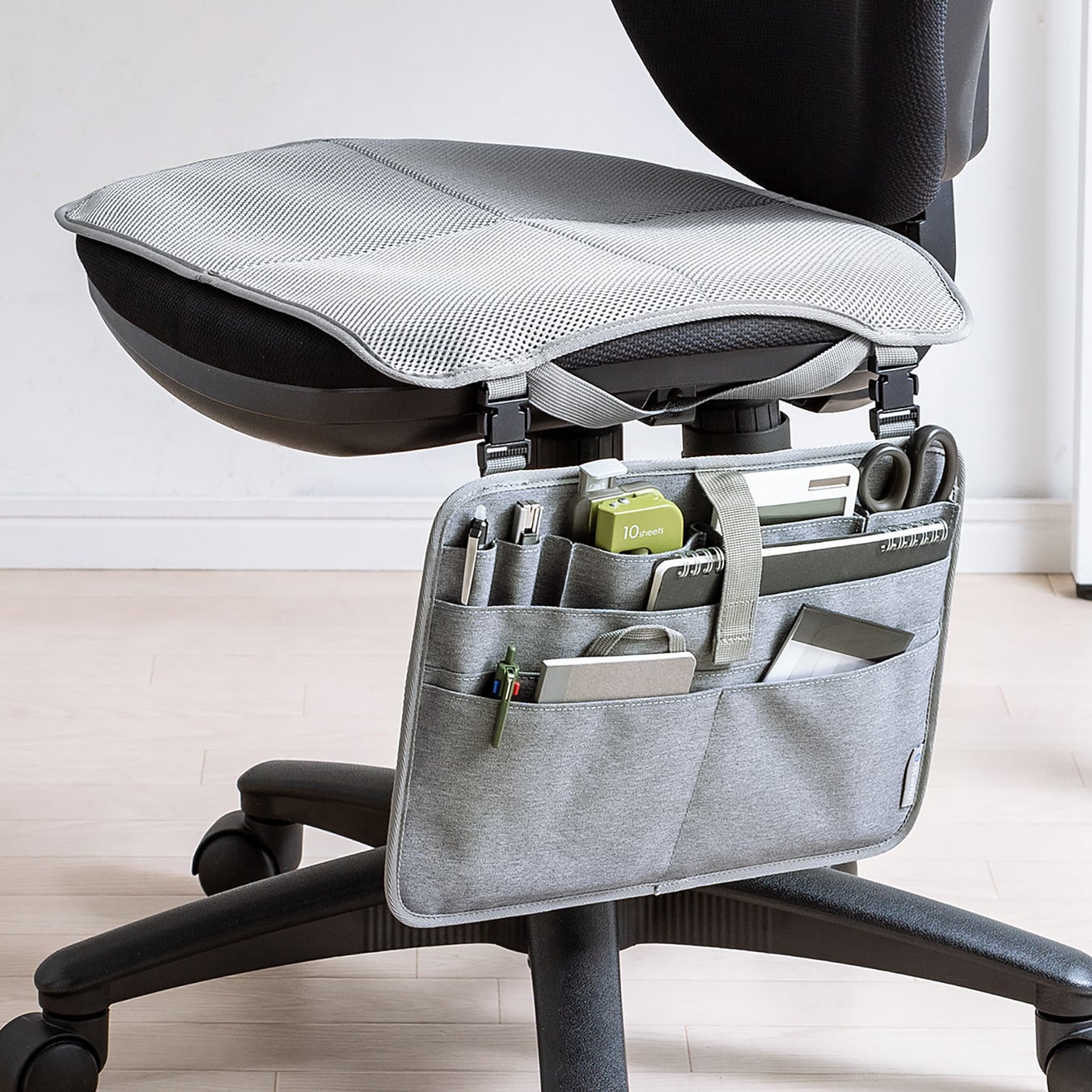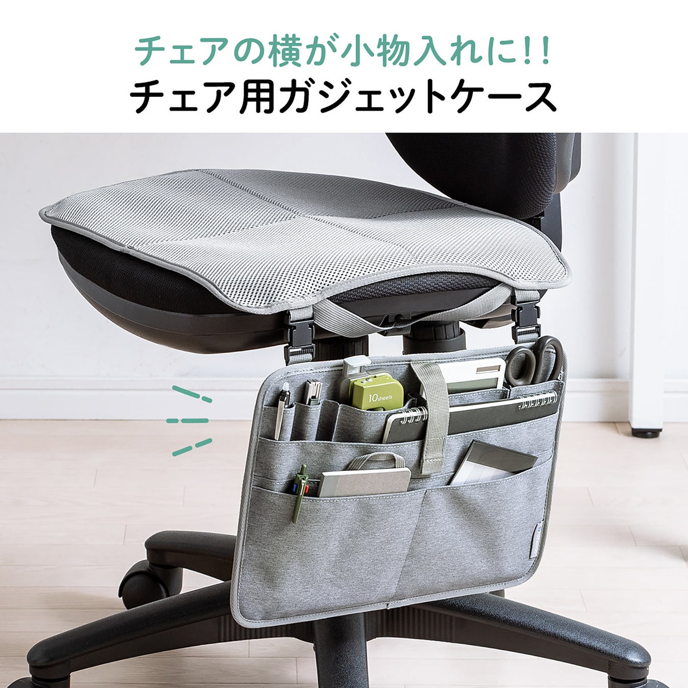 本製品は、チェアに後付けして小物収納を作ることができるチェアガジェットケースです。