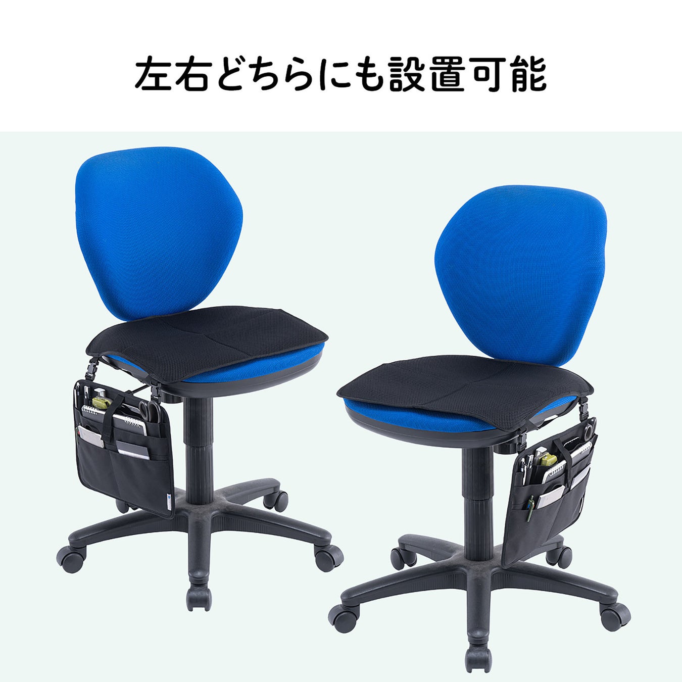 パッドを座面に敷いて、左右どちらかに取り付けするだけの簡単設置が可能です。