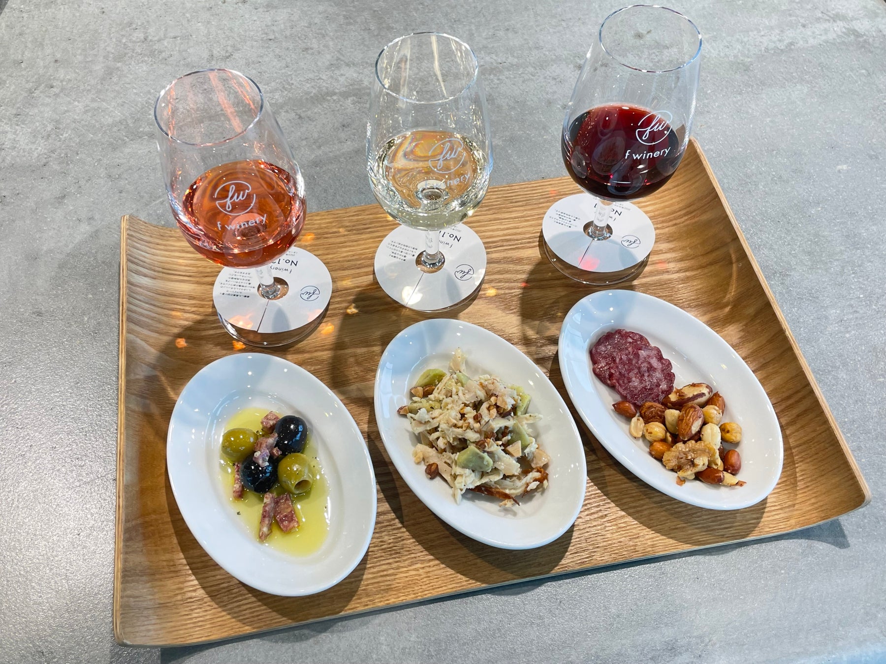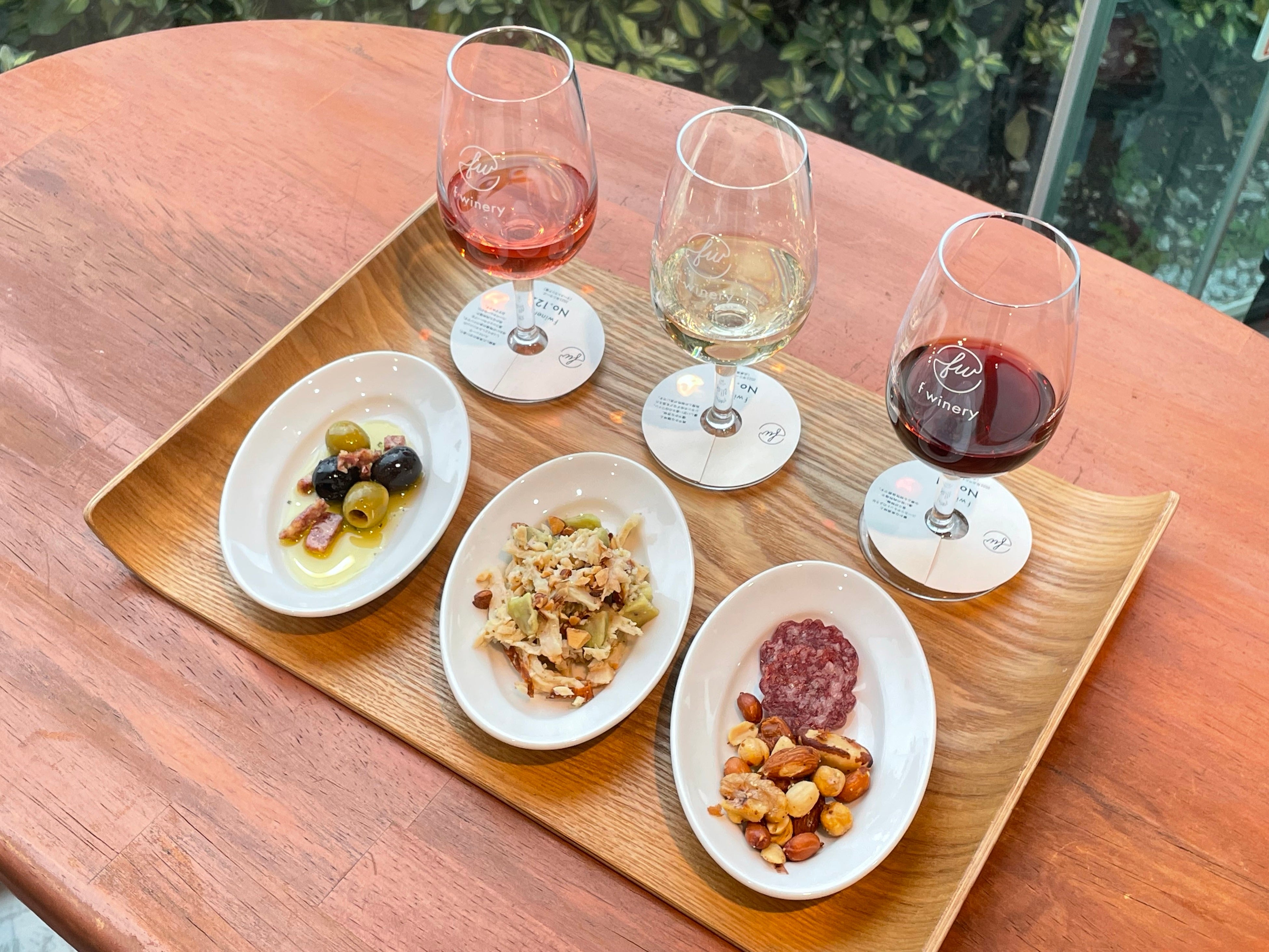f wineryの店舗・スタンド(カフェ&バー)エリアで初提供する「樽出しf wineryNo.133神戸産メルロー〈ロゼ〉」と、「〈f wineryNo.117〉オーストラリア産コロンバール・白ワイン」、「〈f wineryNo.109〉オーストラリア産シラーズ・赤ワイン」を飲み比べることができます。※No.117とNo.109はボトル詰めワインです。