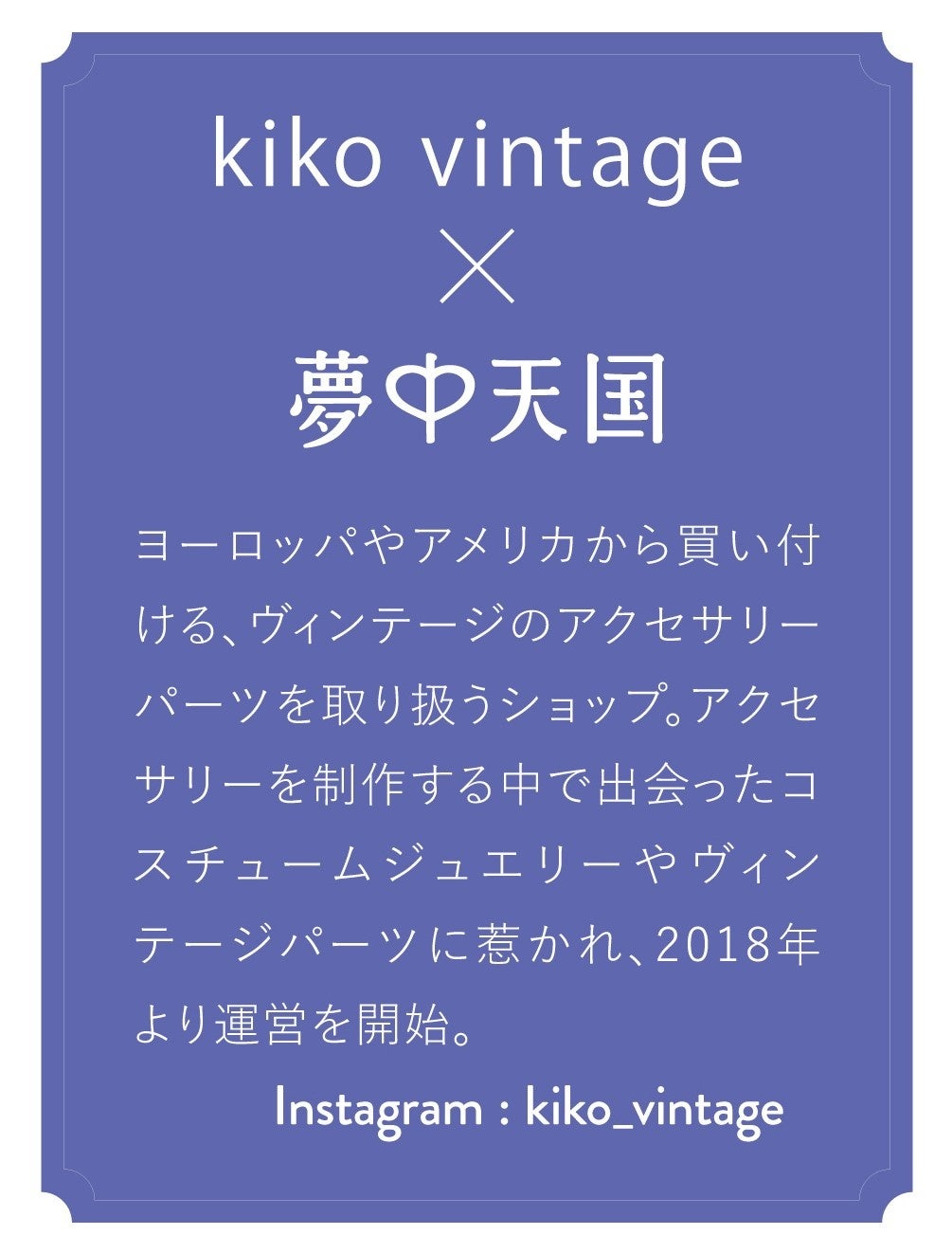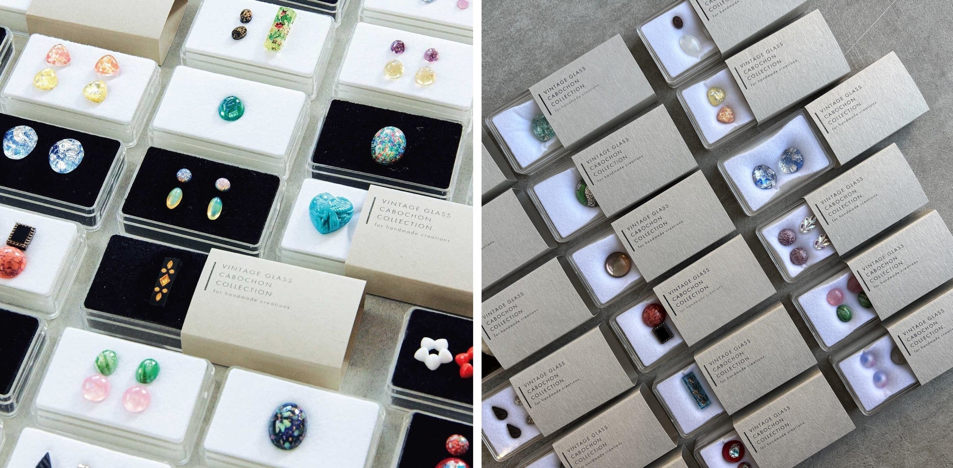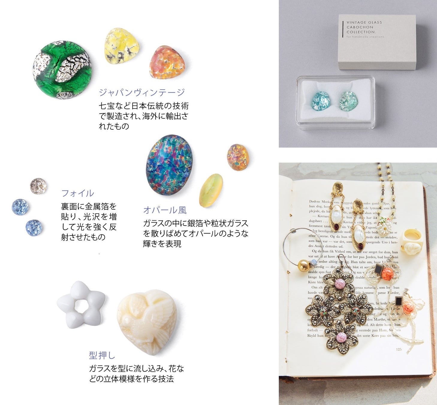 日本の伝統技術で製造された後、海外に輸出された〈ジャパンヴィンテージ〉や裏面に金属箔が貼られた光輝く〈フォイル〉など、多種多様なデザインが楽しめます。箱に入って届くので、そのまま飾るのも◎。背面が平らなので、ピアスやリングなど、接着剤で手軽にアクセサリーが作れます。ヴィンテージのアクセサリーパーツを取り扱う「kiko vintage」と夢中天国のコラボ商品です。
