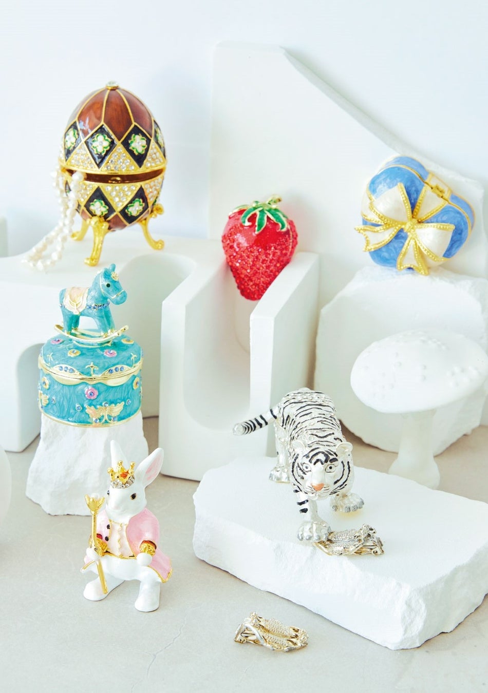 中世ヨーロッパの貴婦人たちが使用していた贅沢な装飾のピルケースを模した、小さくて愛らしいジュエリーボックスです。アンティーク風のたたずまいで、1点ずつ職人さんの手作業で仕上げられています。エナメルの光沢感やラインストーンのきらめきが美しく、ずしりと持ち重りする冷たい手ざわりも本格的です。デザインは〈EGG〉、〈STRAWBERRY〉、〈HEART〉、〈HORSE〉、〈RABBIT〉、〈TIGER〉の6種類。容量は小さめなので、オブジェとして楽しむのもおすすめです。お部屋に飾れば貴婦人気分を楽しめます。