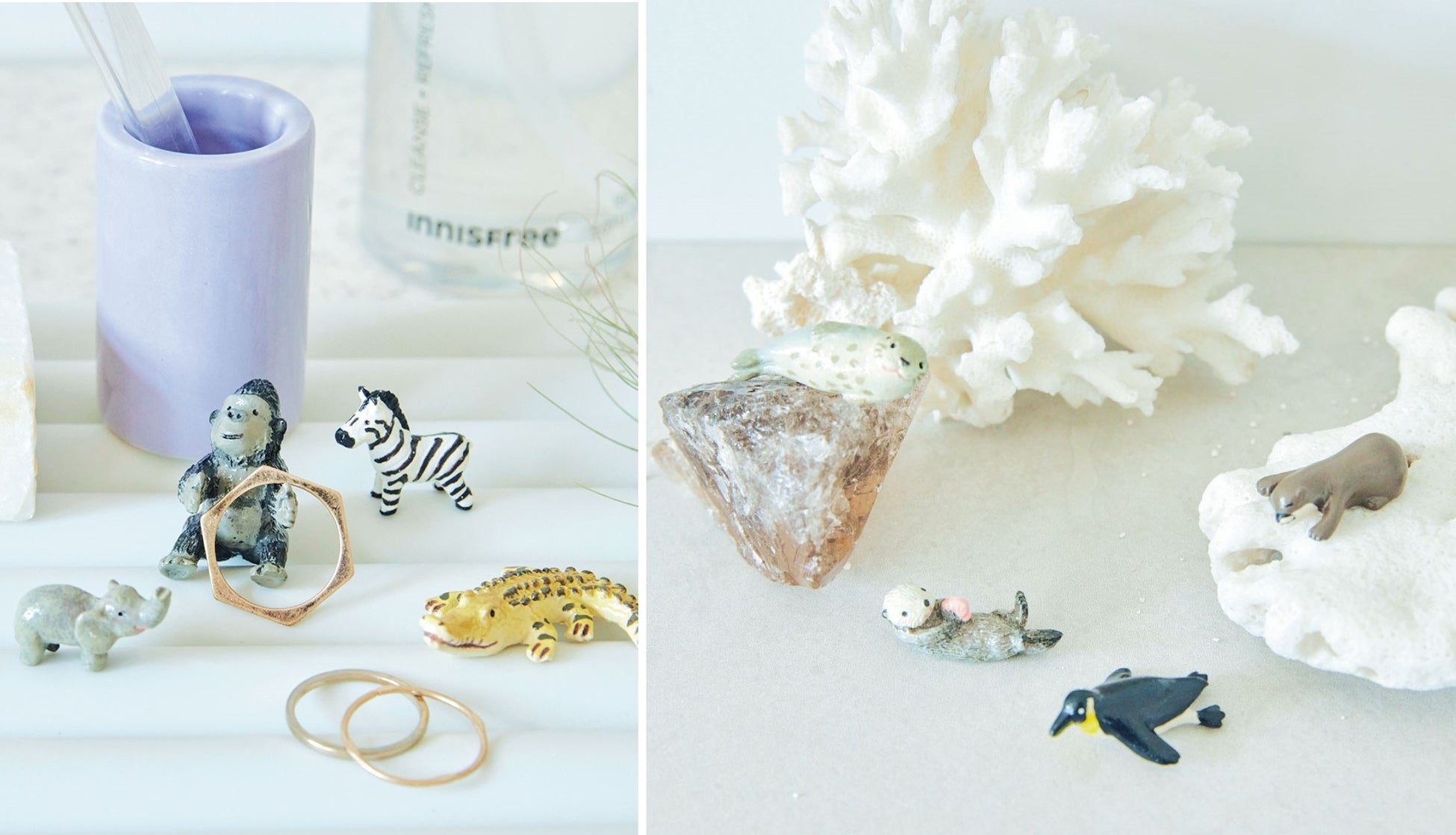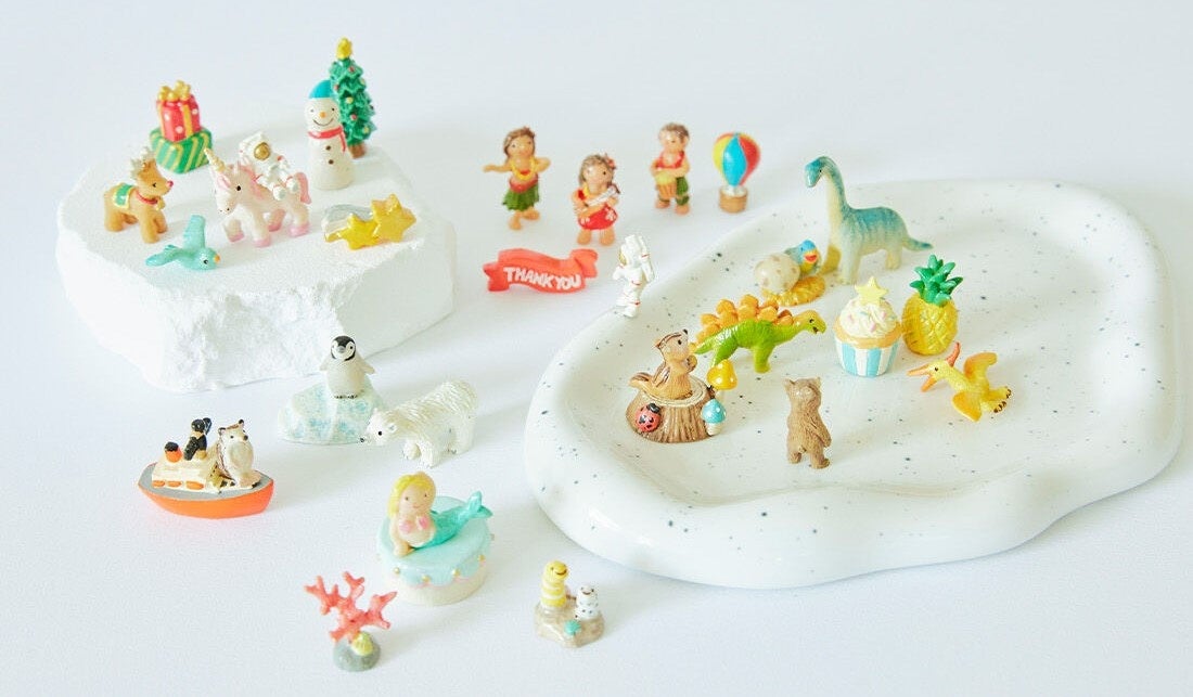 職人さんの手塗りによる絵付けが、あたたかい雰囲気のミニチュアフィギュアです。別世界の主人公たちのほっこりやさしい表情に癒やされます。デザインは〈恐竜時代〉、〈ラッキーモチーフ〉、〈人魚の国〉、〈ありがとうの気持ち〉、〈森の学校〉、〈サファリ〉、〈リラックスタイム〉、〈ポーラー〉、〈クリスマス気分〉、〈ハワイアン〉の全10種類です。テーマに沿って選ばれた4つが1セットになっています。それぞれで飾ったり、自由に組み合わせたり、いろいろな楽しみ方ができます。