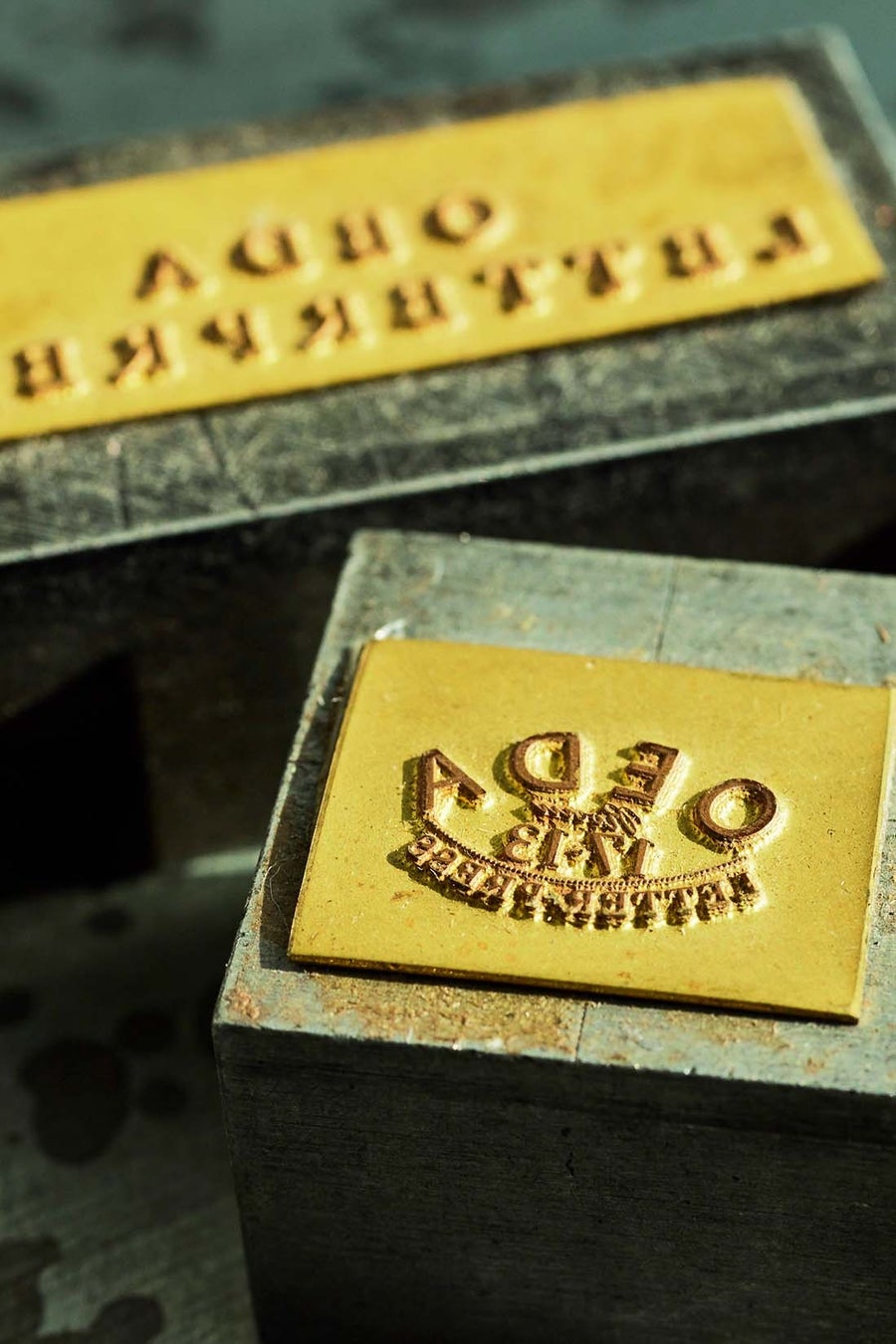 印刷には真ちゅうなどで作られた凸版を使用。凹凸のある味わいは活版印刷ならではの魅力です。ドイツのハイデルベルグ社製のプラテンという昔ながらの活版印刷の機械と技術を生かし、暮らしに寄り添う紙文具を作る「大枝活版室」の洗練されたデザインと活版印刷の味わいを存分に楽しんでいただけます。