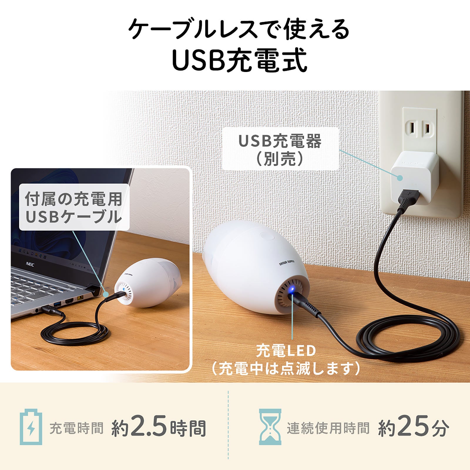 ケーブルレスで使うことができる充電式タイプで、約2.5時間の充電で、連続使用時間約25分使用することができます。