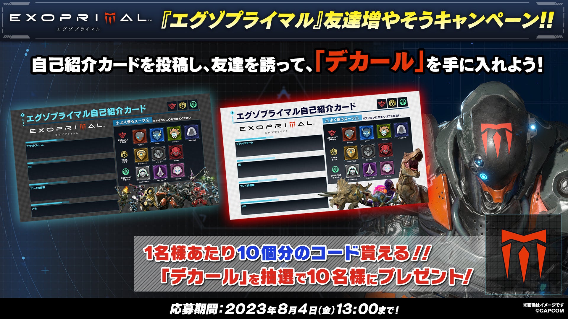 エグゾプライマル自己紹介カードをTwitterにて投稿いただいた方の中から、ゲーム中で使える「EXOPRIMAL Mawデカール」を抽選で1名様あたり10個分のコードをプレゼントするキャンペーンを実施中! 『エグゾプライマル』自己紹介カードを投稿し、友達を誘って「EXOPRIMAL Mawデカール」を手に入れよう!