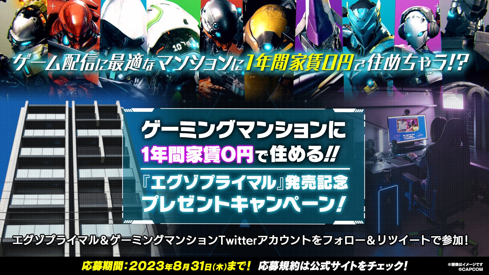 - 【2023年8月31日(木) 13:00まで】『エグゾプライマル』発売を記念して、ゲーミングマンションに1年間家賃0円で住める権利が抽選で1名様に当たるキャンペーンを開催中!!