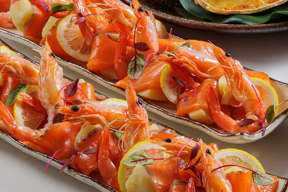 冷製料理は海老・スモークサーモン・レモン風味のポテトの華やかな前菜、鯛・甘海老・鰤のお造り盛り合わせ、丁寧に仕込んだ自家製ポークリエットを神戸の人気ベーカリー“イスズベーカリー”のバケットで挟んだリエットサンド、サラダ類など。