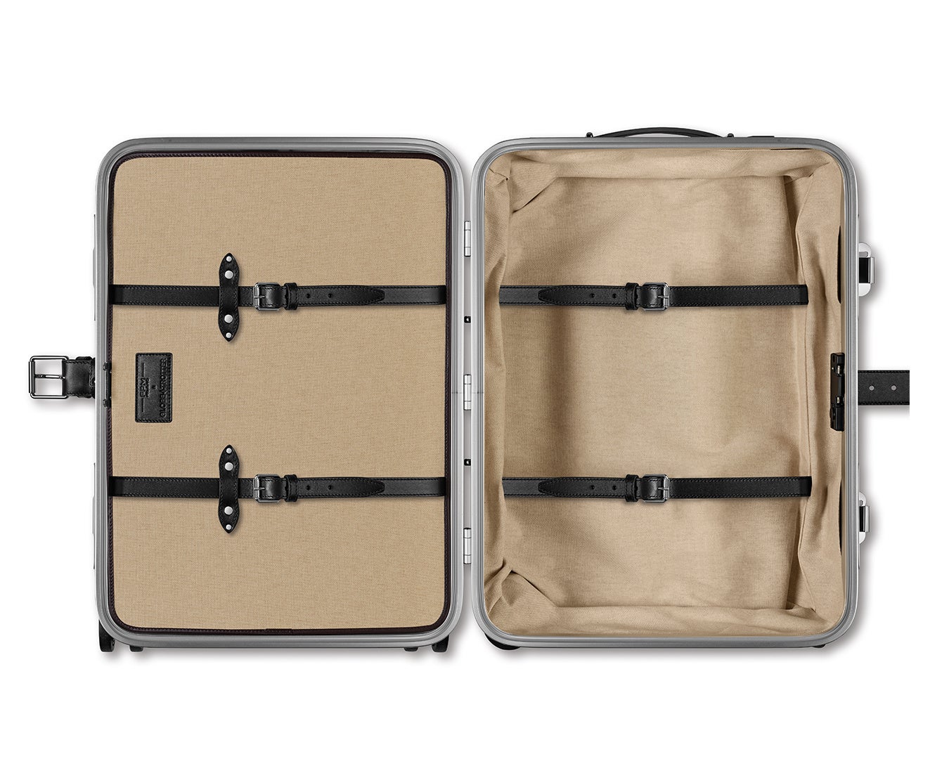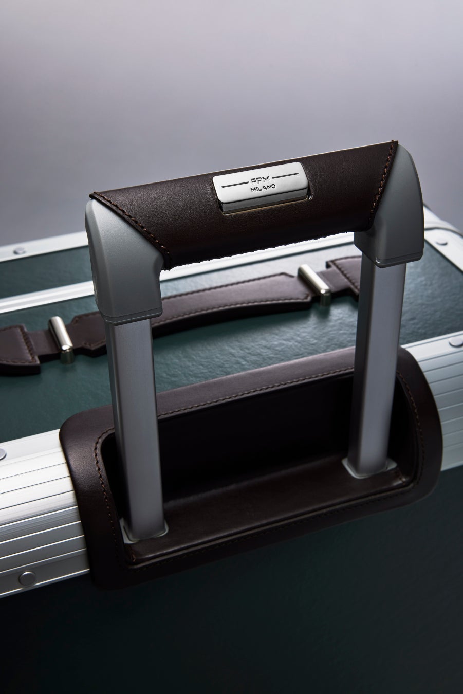 デザインの随所には、両メゾンのアイデンティティがさりげなく織り込まれ、ベルトやレザーループのディテール、さらに「センテナリー」コレクションに着想を得たハンドル(持ち手)には、GLOBE-TROTTERらしいビジュアルを反映。さらに、イタリアンレザーで包まれたテレスコピックハンドル(伸張式ハンドル)が全体のデザインを美しく引き締め、手触りの良さ、バランス、そして日常使いにおける快適さへと昇華。