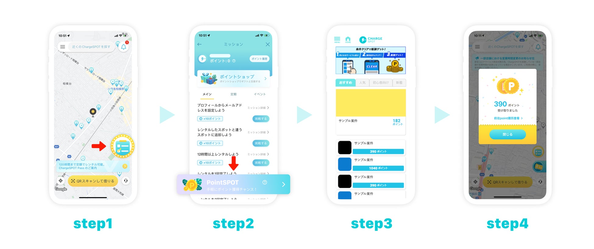 「ChargeSPOT」公式アプリには、ミッション機能があり、モバイルバッテリーのレンタル回数や、指定された場所への返却などを達成するとポイントを貯めることができます。