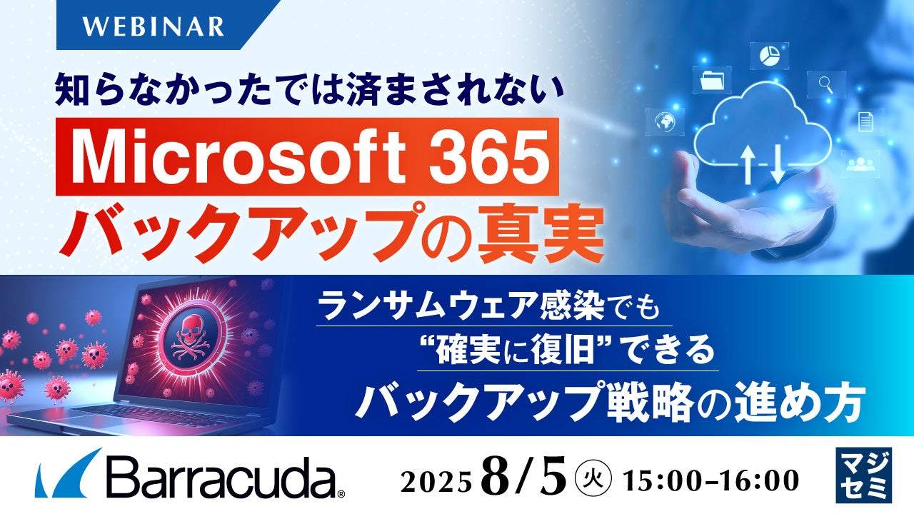 本セミナーでは、実際に起きた復旧失敗の例をもとに、Microsoft 365環境におけるバックアップの重要性を解説します。また、Microsoft 365のバックアップ対策の最適解として「Barracuda Cloud-to-Cloud Backup」をご提案。個別ファイル・フォルダ単位でのリストアや、Entra IDの保護、容量無制限、ランサムウェアスキャン機能など、ランサムウェア対策にも役立つより柔軟で確実なバックアップ運用を支援できる特長などを紹介します。