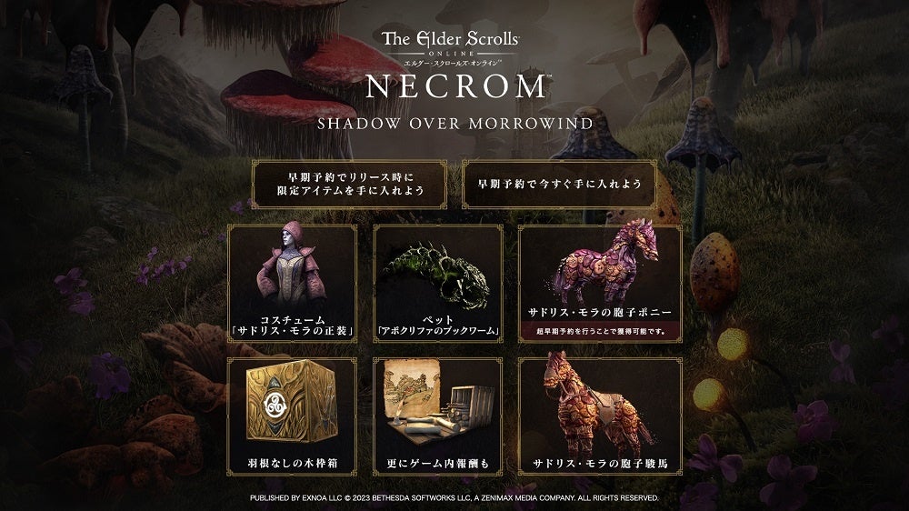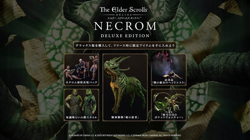 権利表記 :Published by EXNOA LLC (c)2023 ZeniMax Media Inc. The Elder Scrolls(R)Online: Necrom(TM) developed by ZeniMax Online Studios LLC, a ZeniMax Media company. ZeniMax, The Elder Scrolls, Necrom, ESO, ESO Plus, Bethesda, Bethesda Softworks and related logos are registered trademarks or trademarks of ZeniMax Media Inc. in the US and/or other countries. All Rights Reserved.