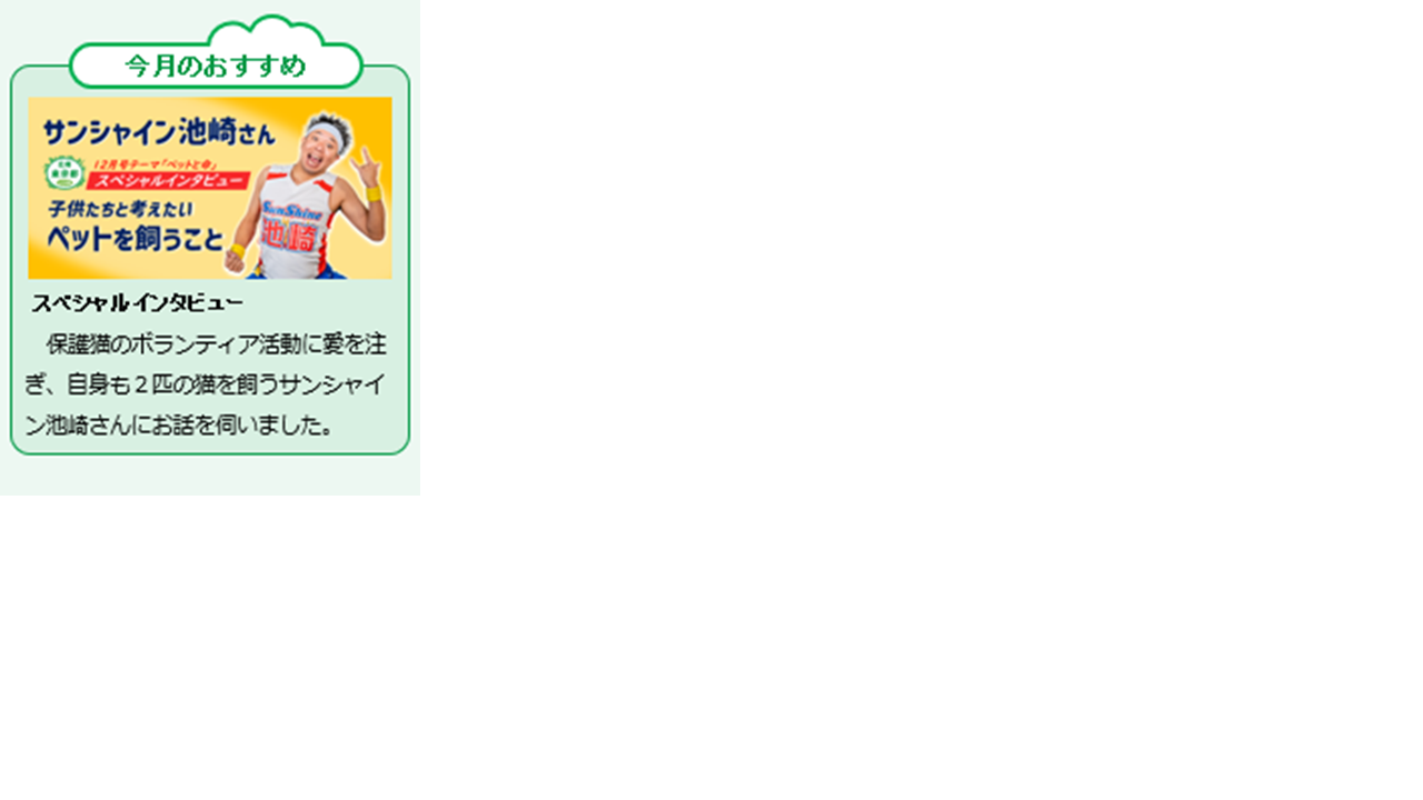 人とペット、双方の幸せに必要なことは何でしょうか。飼い主を失い保護される犬猫の事例も紹介し、命の大切さや命を預かる責任について、子供達に考えてもらおうという企画です。今月号はWEB版に加え、都内の小学校、児童館に配布する「壁新聞(印刷版)」も発行しました。ぜひご注目ください。