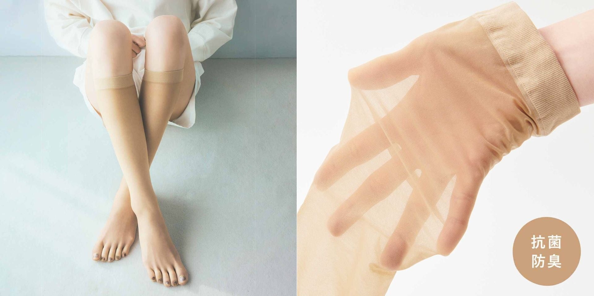 伸びやかなすべすべ素材で、するっとはきやすく、汗やにおいなどのエチケット対策も◎。素肌風のシアーな透明感ながら、特殊な編み立てで破れにくいのも特徴です。暑い季節、気になる毎日の足もとに自信が持てます。